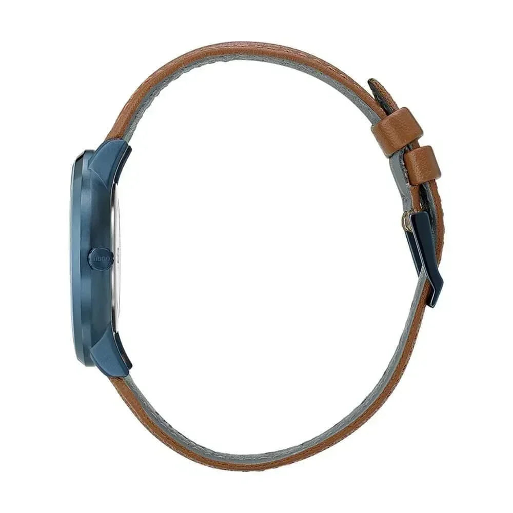 This Hugo Boss watch has a colour coated stainless steel case 40mm in diameter and is fitted with a brown leather strap. Inside the case lies a movement and the watch features a mineral crystal. White dial color with blue case, tangue buckle clasp. Water resistance upto 30 meters.