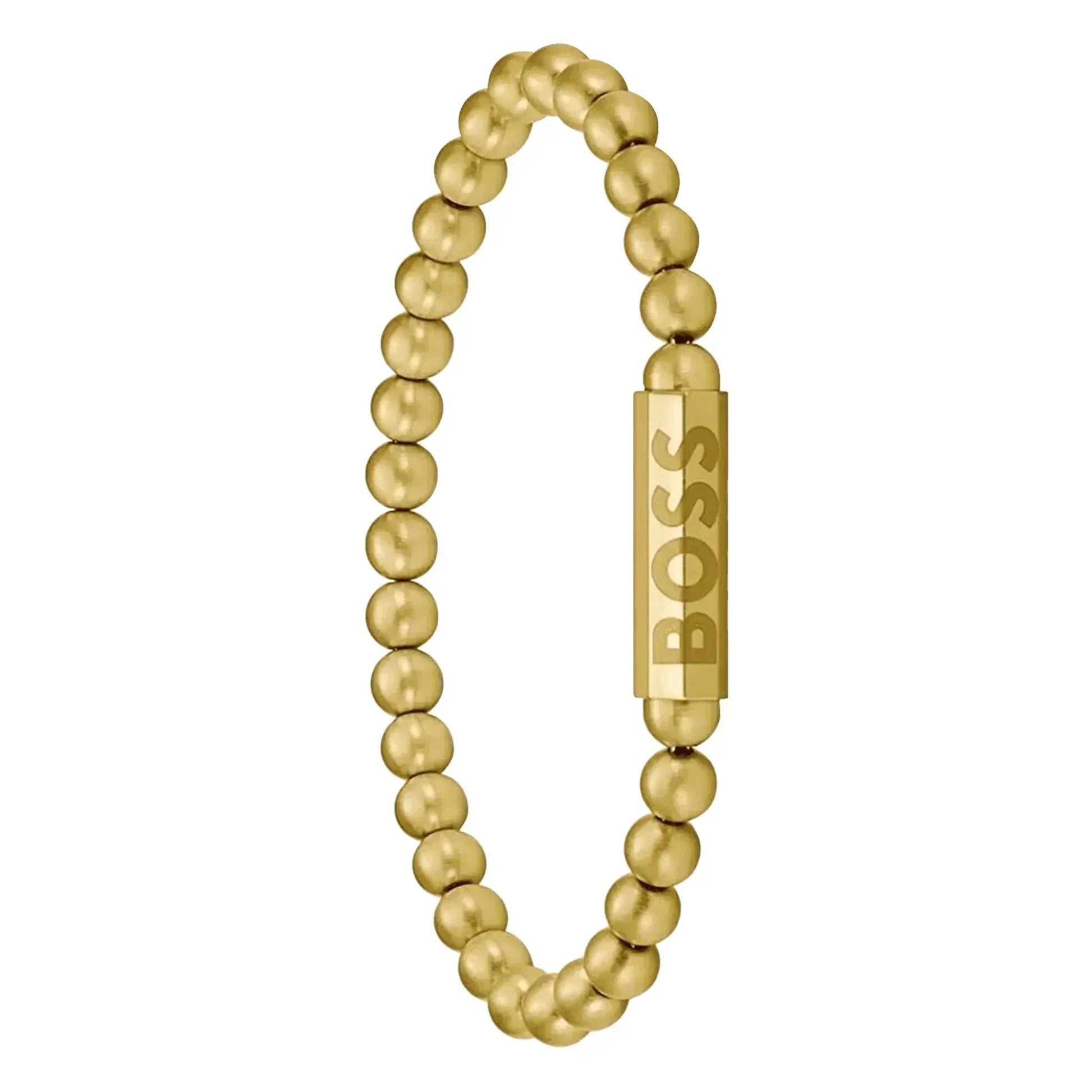 Hugo Boss Jewellery Men's Sphere Metal Collection Beaded Bracelet 1580666M. This stylish bracelet features premium brushed stainless steel with yellow gold ion plating with an octagonal-shaped magnetic closure with an engraved boss logo, this piece from the sphere collection adds a touch of sophistication and secure style to any modern man's wardrobe. This gold ion-plated bracelet is available in size 19 cm with 6mm wide beads, ensuring a luxurious and comfortable fit for medium-sized wrists.