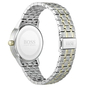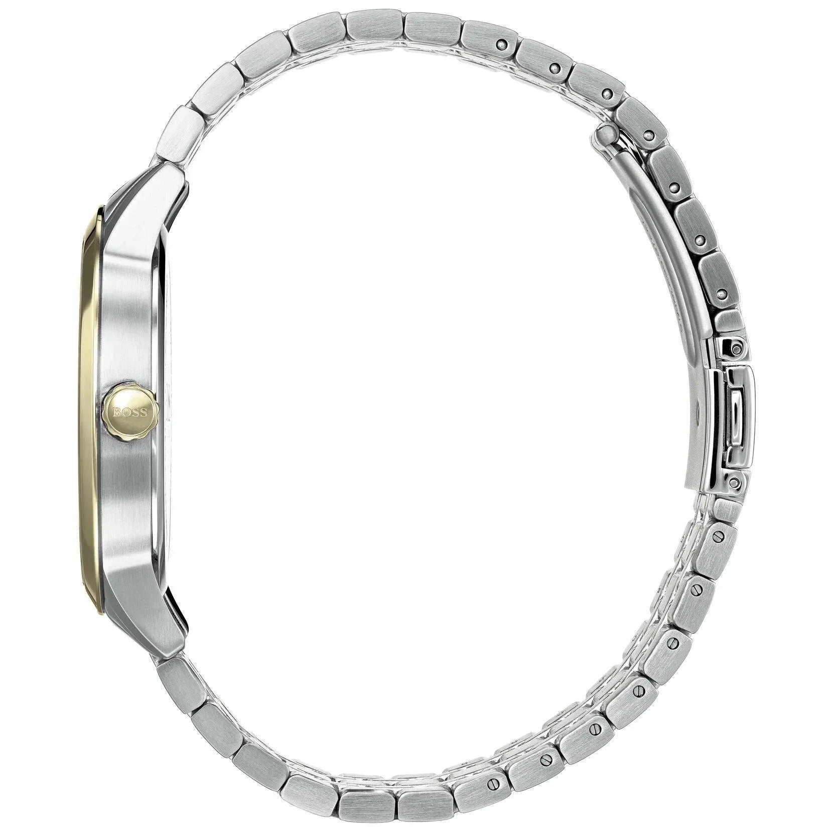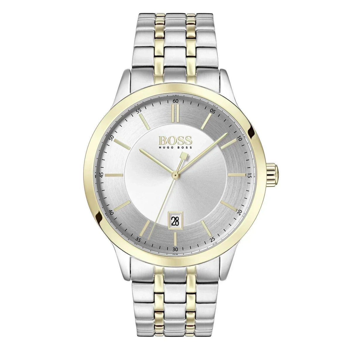 Hugo boss Officer silver dial men's watch-1513687. Case is made out of two-tone stainless steel, which stands for a high quality of the item and the silver dial gives the watch that unique look. In regards to the water resistance, the watch has got a resistancy up to 30 metres. It means it can be worn in scenarios where it is likely to be splashed but not immersed in water. Quartz movement. Mineral crystal. Case size 41mm. push button deployment clasp.