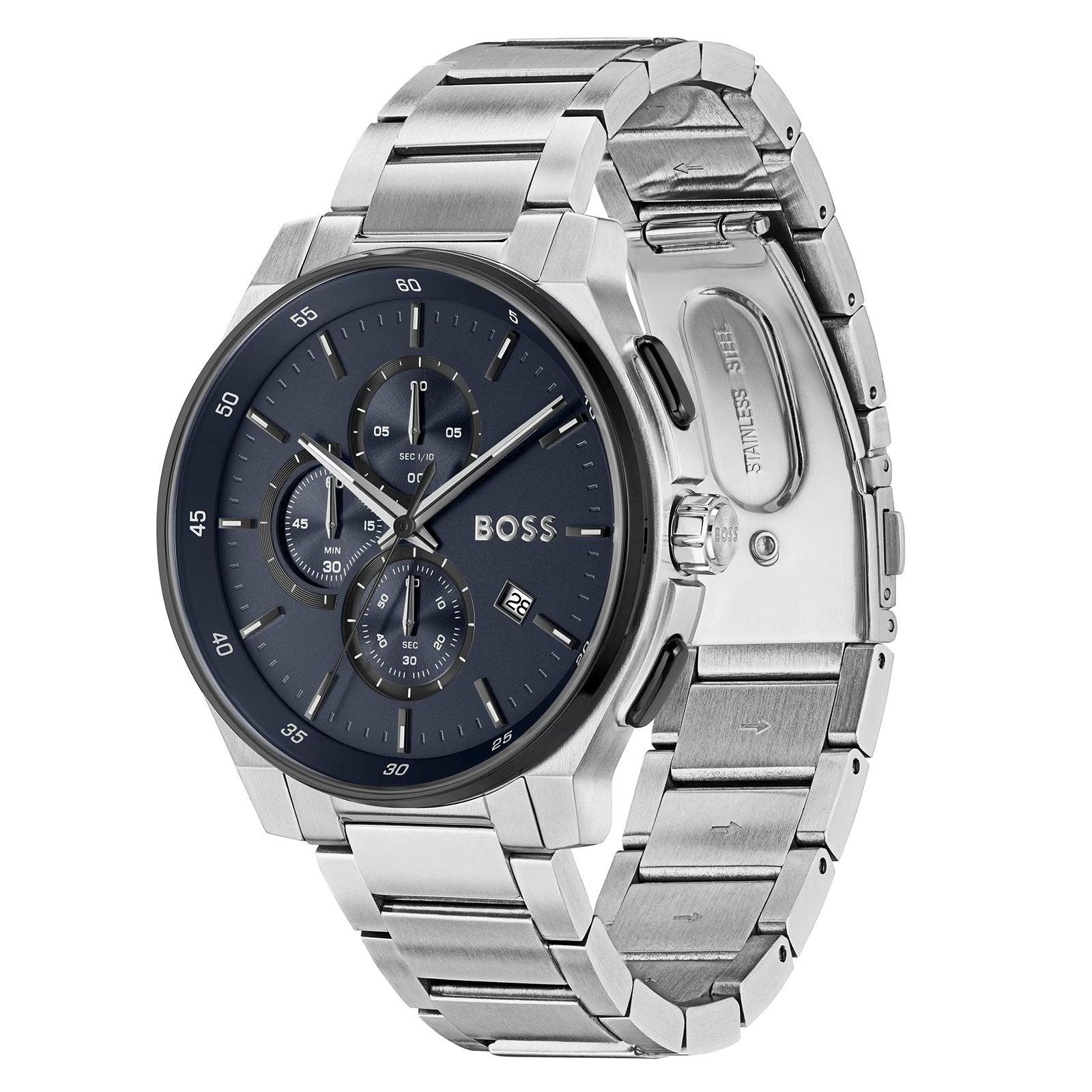 Boss Peak Chronograph quartz mens watch 1514189. Stainless steel case and bracelet with blue dial. Quartz movement. Water resistance up to 50 meters. Case size 45 mm. Deployment clasp with push button.