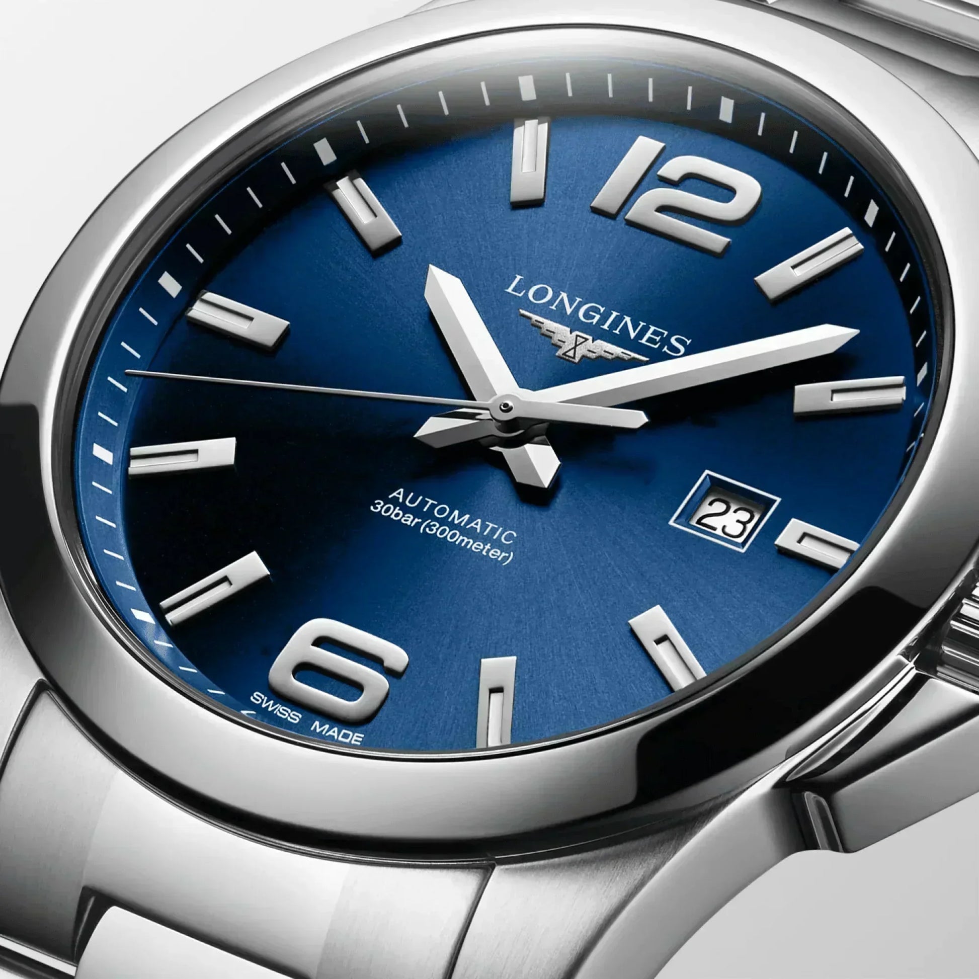 The elegance of performance Without sacrificing elegance, the Conquest line perpetuates the spirit of conquest of all those who have dared to go further than others in their quest for new horizons. The same spirit has been behind the models in the Conquest collection since 1954. Each watch contains a subtle fusion of performance and elegance, including the most demanding technical features. Stainless steel material with sunray blue dial. Round case shape. Scratch resistant sapphire crystal, with several layers of anti-reflective coating on the underside. Stainless steel bracelet with triple safety folding clasp and push piece opening mechanism. Automatic self-winding mechanical movement beating at 25'200 vibrations per hour, with a power reserve of approximately 72 hours. Water resistance up to 300 meters. Functions: Hours, minutes, seconds and date.