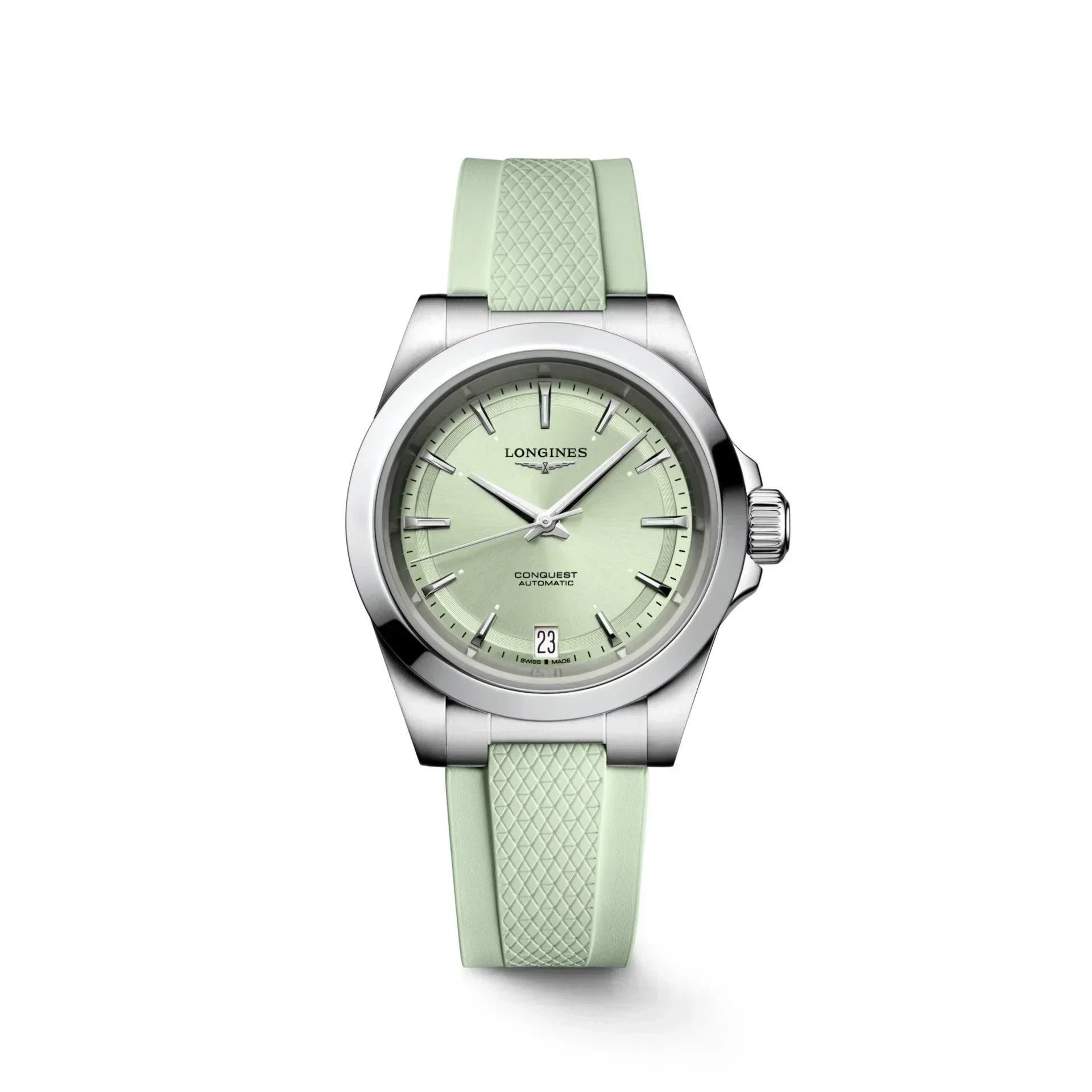 Longines Conquest automatic womens watch L34304029. Stainless steel case with green rubber strap with sunray green dile. Case size 34mm. Scratch-resistant sapphire crystal, with several layers of anti-reflective coating on both sides screw-down and transparent with sapphire crystal case back. Automatic movement self-winding mechanical movement beating at 25'200 vibrations per hour, with a monocrystalline silicon balance-spring power reserve up to 72 hours. Double security folding clasp with micro adjustment system. Water-resistant to 10 bar 100 meters.