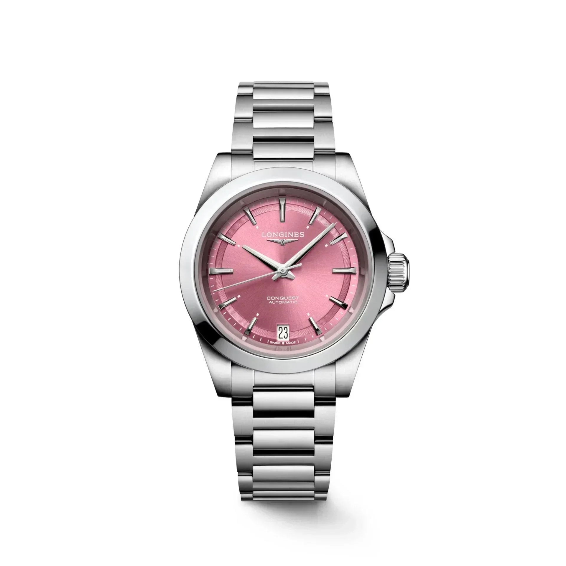 Longines Conquest automatic womens watch L34304996. Stainless steel case and bracelet with sunray pink dile. Case size 34mm. Scratch-resistant sapphire crystal, with several layers of anti-reflective coating on both sides screw-down and transparent with sapphire crystal case back. Automatic movement self-winding mechanical movement beating at 25'200 vibrations per hour, with a monocrystalline silicon balance-spring power reserve up to 72 hours. Triple safety folding clasp and push-piece opening mechanism. Water-resistant to 10 bar 100 meters.