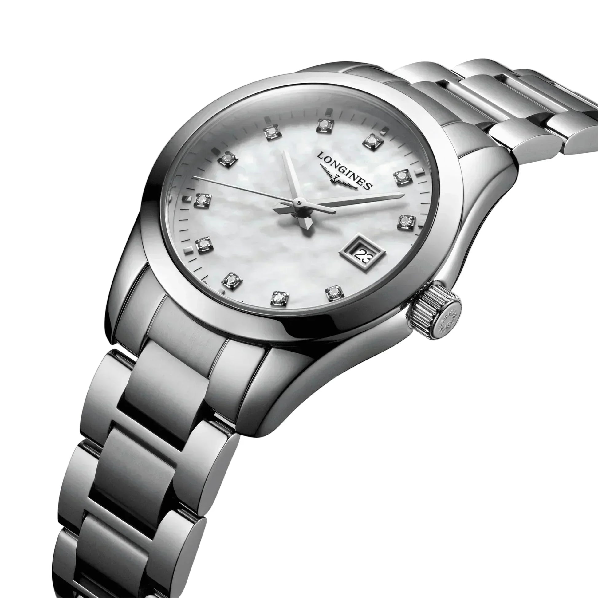 The new Conquest Classic is bold, yet refined.As a partner of many of the most prestigious sports events in the world, Longines was keen to launch a collection of timepieces to be worn amidst the excitement of these competitions. As a tribute to the chronographs produced from 1878 on, the famous Swiss watchmaker presents the Conquest Classic line. True to the brand’s values of elegance, tradition and performance, this collection of models, all fitted with self-winding calibres, is at the same time totally contemporary and perfectly timeless. Stainless steel material with White Mother-of-pearl dial. Dial set with 11 Top Wesselton VS-SI diamonds, for a total of 0.074 carats. Round case shape. Scratch resistant sapphire crystal, with several layers of anti-reflective coating on the underside. Stainless steel bracelet with triple safety folding clasp and push piece opening mechanism. Quartz movement. Water resistance up to 50 meters. Functions: Hours, minutes, seconds and date.