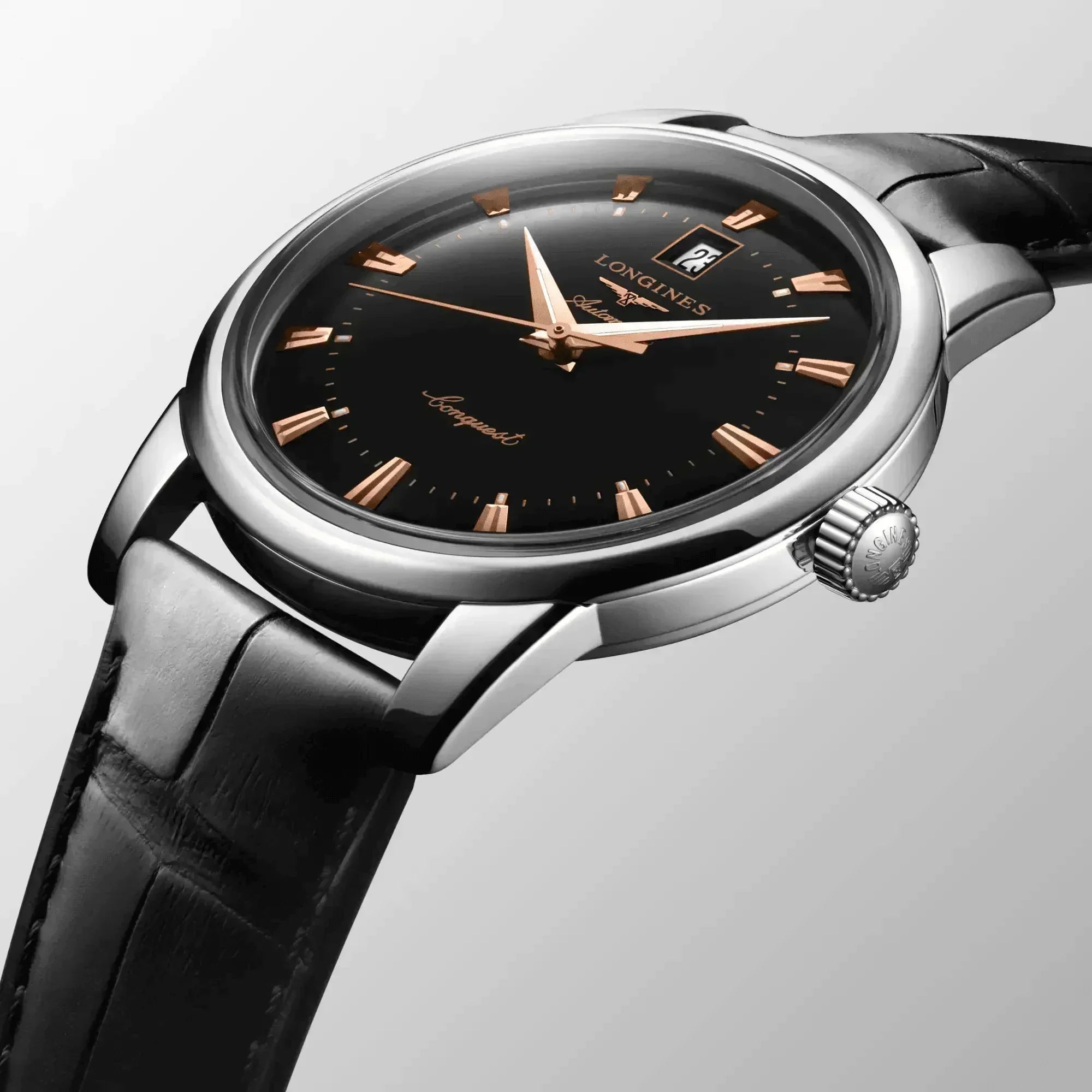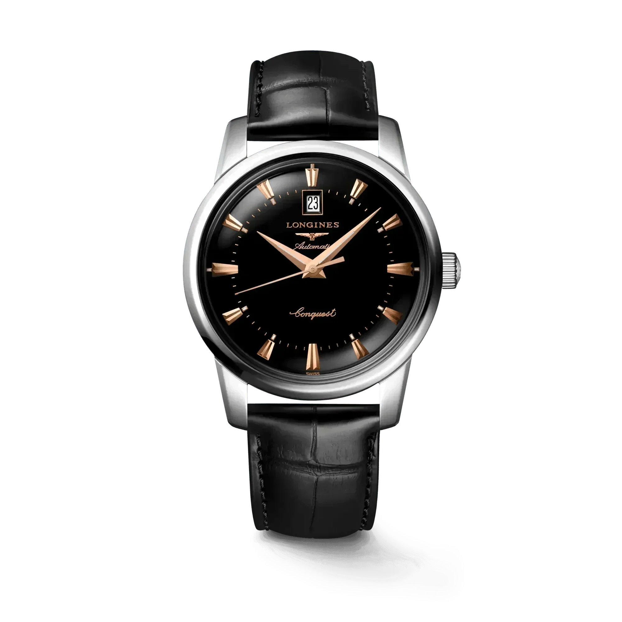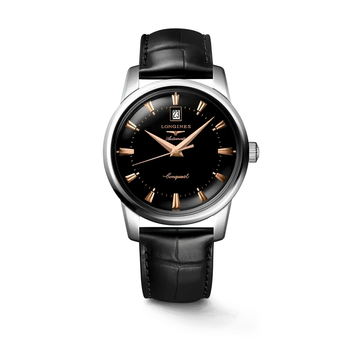 Longines combines the original aesthetics of its most remarkable historic models with the most modern watchmaking techniques. Heritage Classic pieces are a tribute to the innovative spirit that has driven Longines’ watchmakers from the outset. Longines timepieces draw from this expertise and illustrate the durability that is the brand’s signature, as well a consistent desire to honor history. Stainless steel with Black lacquered polished dial. Round case shape. Scratch-resistant sapphire crystal, with several layers of anti-reflective coating on the underside. Alligator leather with buckle clasp. Automatic self-winding mechanical movement beating at 25'200 vibrations per hour, with a power reserve of approximately 72 hours. Functions: Hours, minutes, seconds and date. Water resistance up to 30 meters.
