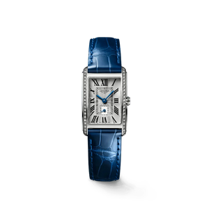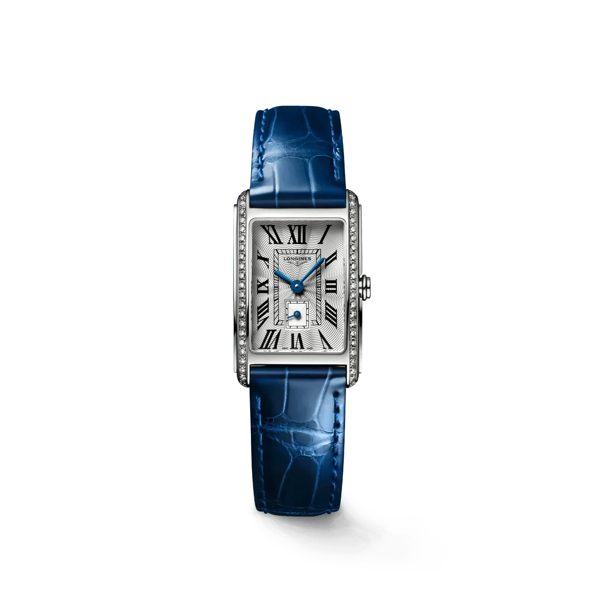 The Italian Way of Life Enhanced by a timeless elegance. Since its inception, the Longines DolceVita collection has illustrated contemporary elegance of the Longines watchmaking brand worldwide. Inspired by the "Dolce Vita", it is an homage to the sweetness of life. Today, a new chapter in this collection opens with a unique interpretation featuring softened lines. These new variations will not fail to impress women who have made charm a way of life. Stainless steel with Silver "flinqué" dial. Case set with 46 Top Wesselton IF-VVS diamonds, for a total of 0.386 carats. Rectangular case shape. Scratch resistant sapphire crystal. Alligator leather with buckle clasp and easily change your bracelet/strap thanks to the Longines interchangeable system. Water resistance up to 30 meters. Quartz movement. Functions: Hours, minutes, small seconds at 6 o'clock.