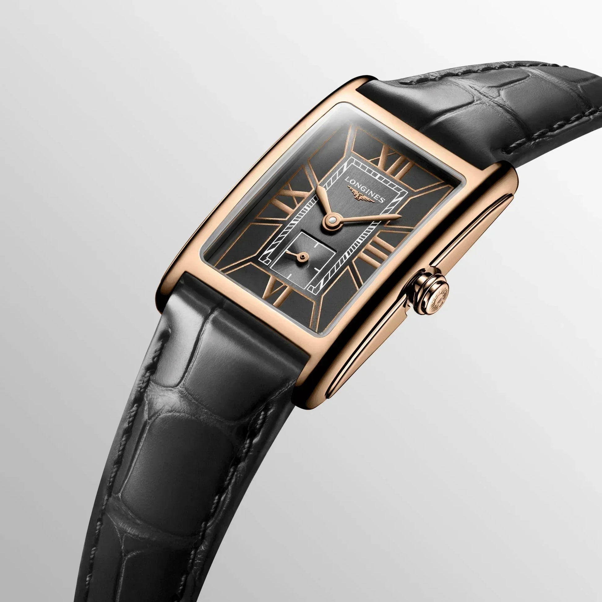 The Italian Way of Life Enhanced by a timeless elegance. Since its inception, the Longines DolceVita collection has illustrated contemporary elegance of the Longines watchmaking brand worldwide. Inspired by the "Dolce Vita", it is an homage to the sweetness of life. Today, a new chapter in this collection opens with a unique interpretation featuring softened lines. These new variations will not fail to impress women who have made charm a way of life. Stainless steel with 18 karat pink gold with black dial. Rectangular case shape. Scratch resistant sapphire crystal. Alligator leather with buckle clasp and easily change your bracelet/strap thanks to the Longines interchangeable system. Quartz movement. Water resistance up to 30 meters. Functions: Hours, minutes, small seconds at 6 o'clock.