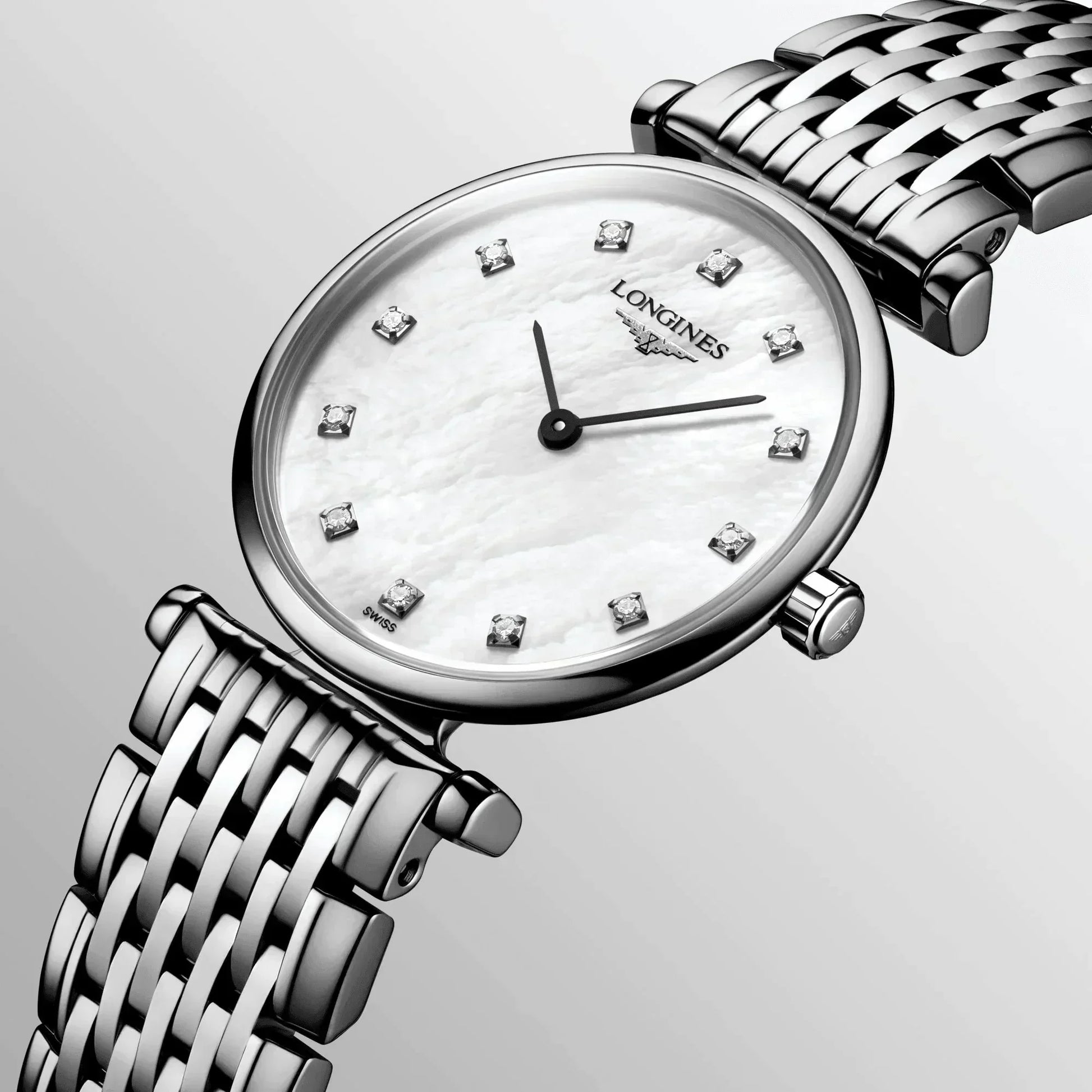The fascination of timeless style. Launched in 1992, La Grande Classique de Longines has played a major role in forging the reputation of the winged hourglass brand. This range is a symbol of Longines’ classic elegance and timeless sophistication, and stands out thanks to its very slim profile and wide palette of versions. Designed for both women and men, this iconic collection can be seen on the wrists of all those who know how to appreciate true value.Red PVD coating with White mother-of-pearl dial. Dial set with 12 Top Wesselton VS-SI diamonds, for a total of 0.048 carats. Round case shape. Scratch resistant sapphire crystal. Stainless Steel with triple safety folding clasp and push-piece opening mechanism. Quartz movement. Water resistance up to 30 meters. Functions: Hours, minutes.