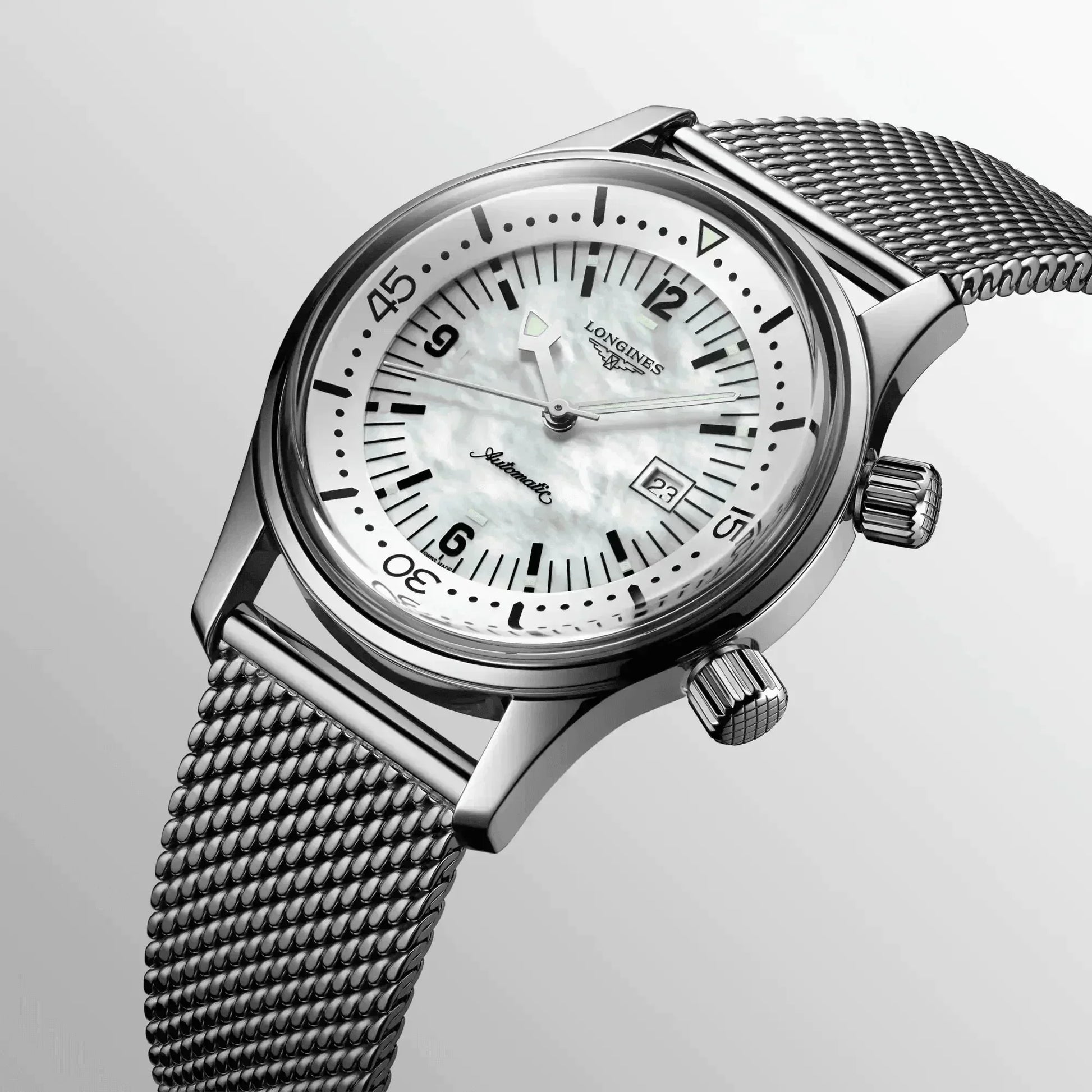The Longines Legend Diver Watch. A reinterpretation of a 1960s diver watch, The Longines Legend Diver occupies a special place in the brand’s Heritage segment. Symbolic of the rich heritage of Longines, this range has gradually expanded over the years. All models retain the spirit and clean lines of the original timepiece, while being equipped with up-to-date technical features. Contemporary yet steeped in history, it will beyond a doubt play its own part in the story of a legendary watch that’s a well-known, well-loved collector’s piece. Stainless steel with White mother-of-pearl dial. Round case shape. Scratch-resistant sapphire crystal, with several layers of anti-reflective coating on the underside. Stainless steel With triple safety folding clasp. Automatic self-winding mechanical movement beating at 28'800 vibrations per hour, with a power reserve of approximately 45 hours. Functions: Hours, minutes, seconds, date. Water resistance up to 300 meters.
