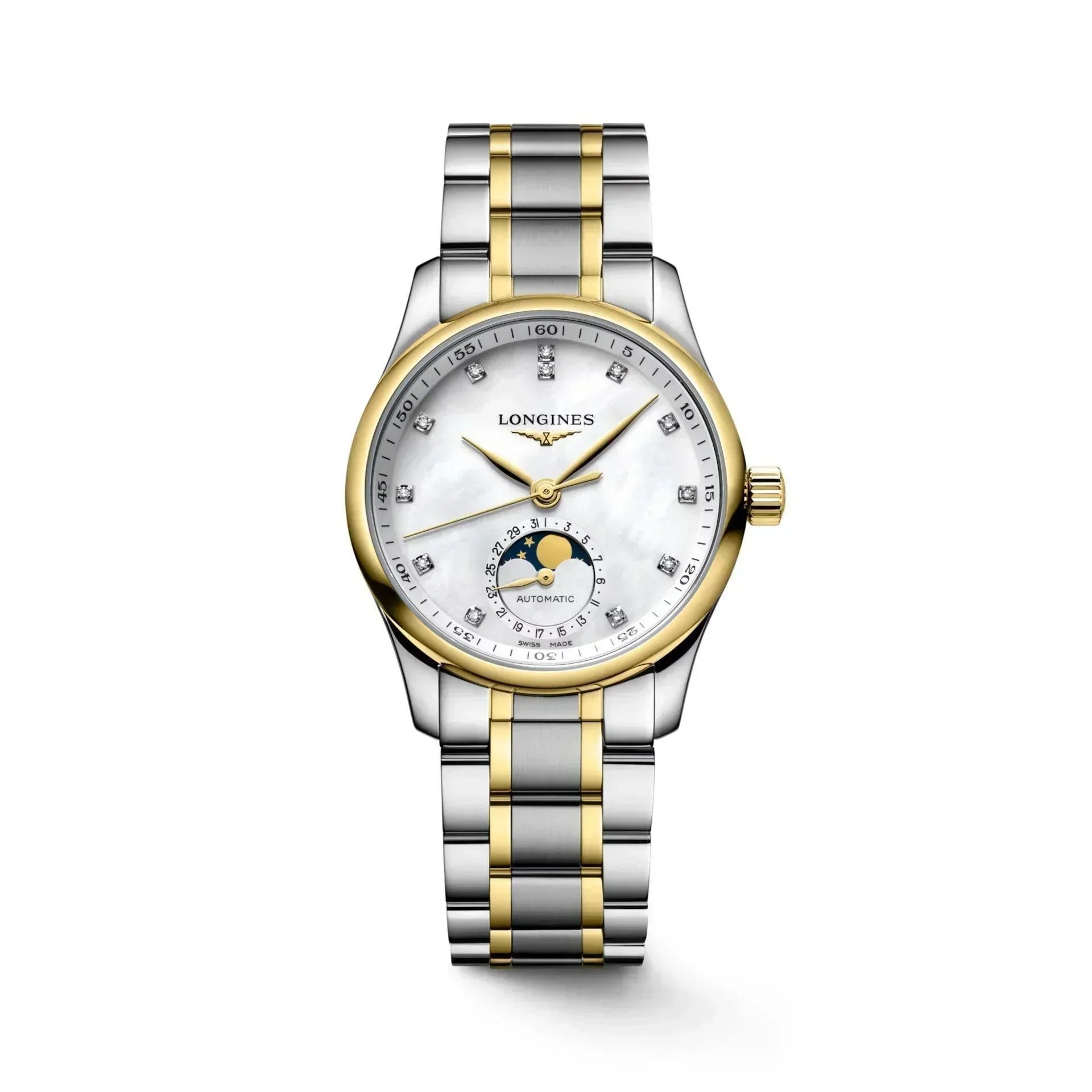 Longines Master Collection Moonphase automatic womens watch L24095877. Stainless steel and 18 karat yellow gold cap 200 case and bracelet with white mother-of-pearl dial. Case size 34mm. Scratch-resistant sapphire crystal, with several layers of anti-reflective coating on both sides and transparent case back with sapphire crystal. Automatic movement Self-winding mechanical movement beating at 25'200 vibrations per hour, with a power reserve up to 72 hours. Triple safety folding clasp and push-piece opening mechanism. Water-resistant to 3 bar 30 meters.