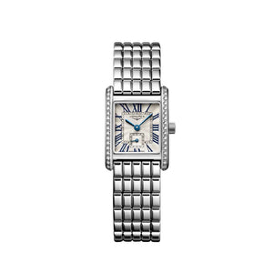 With its discreet profile, classic styling, and aesthetic variations that are at once timely and timeless, the Mini DolceVita exquisitely expresses, in equal parts, LONGINES’ quiet luxury and contemporary elegance. The meticulously designed collection is an extension of the original DolceVita family, inspired by a LONGINES legend created in 1927. Presented in an impressive range of materials and colours, the Mini DolceVita watches feature a discreet 21.50mm x 29mm case and are available with or without diamonds. Scratch-resistant sapphire crystal, with several layers of anti-reflective coating on both sides. Case set with 38 Top Wesselton IF-VVS diamonds, for a total of 0.456 carats. Hours, minutes, small seconds at 6 o'clock. Triple safety folding clasp and push-piece opening mechanism. Water-resistant to 3 bar / 30 meters.