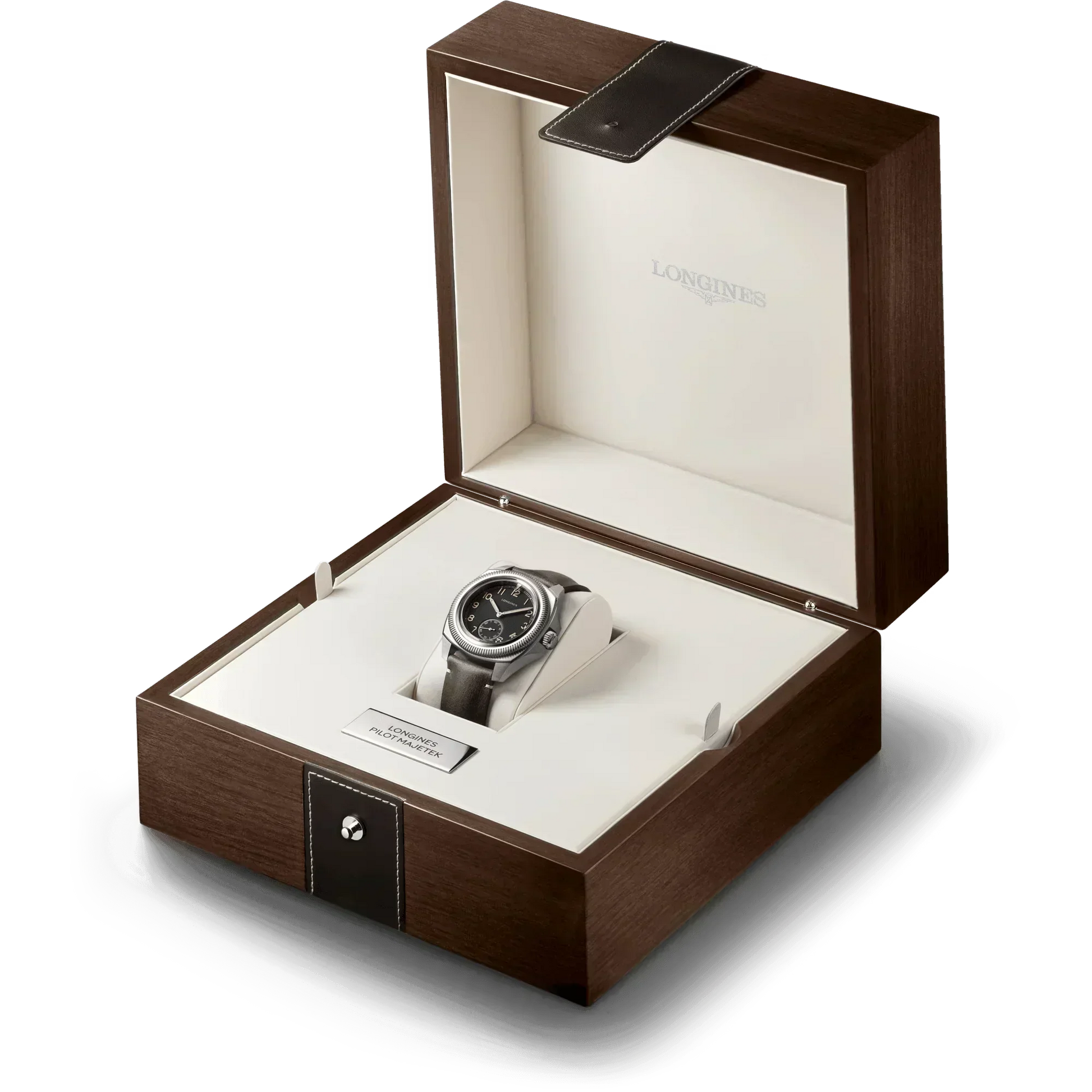 A return of the pilot’s watch The Longines Pilot Majetek is all about uniqueness and distinctiveness.It is a watch with a strong history, a powerful design and impressive resistance, a watch that exudes strength.Its fluted rotating bezel with inner “Starting time indicator” was a key technical challenge that has been overcome.Powered by a mechanical Longines self-winding exclusive calibre, this version is fitted with a brown leather strap with beige stiches. It is delivered in a special presentation box containing a khaki green NATO strap crafted from recycled material.Stainless steel with black matt dial. Round case shape. Scratch-resistant sapphire crystal, with several layers of anti-reflective coating on both sides. Calf leather with buckle clasp. Automatic self winding mechanical movement beating at 25'200 vibrations per hour, with a monocrystalline silicon balance-spring power reserve of approximately 72 hours. Functions: Hours, minutes, small seconds at 6 o'clock. Water resistance up to 100 meters.