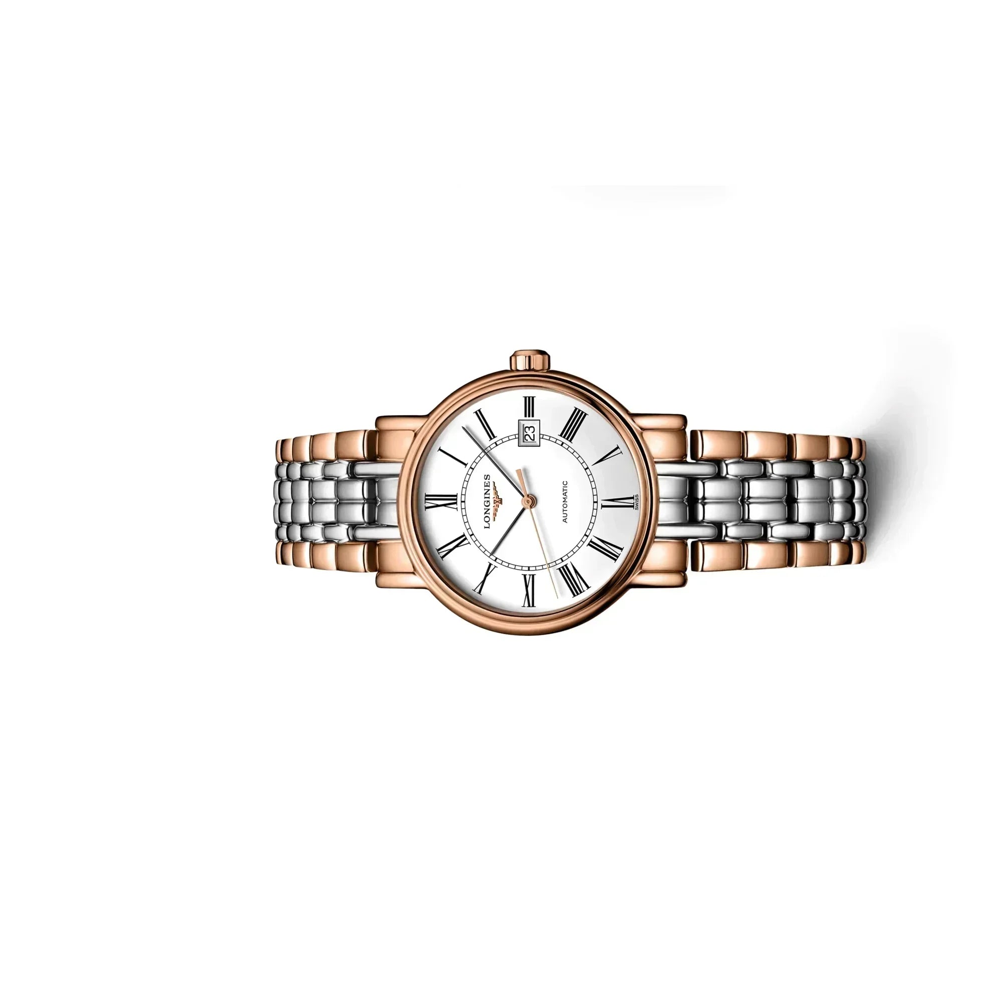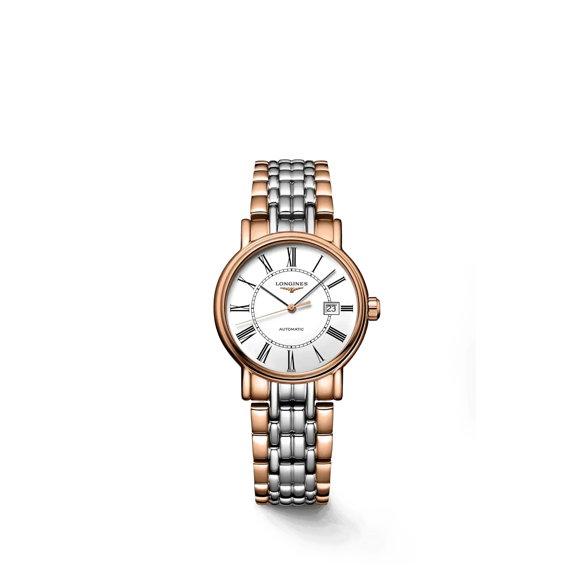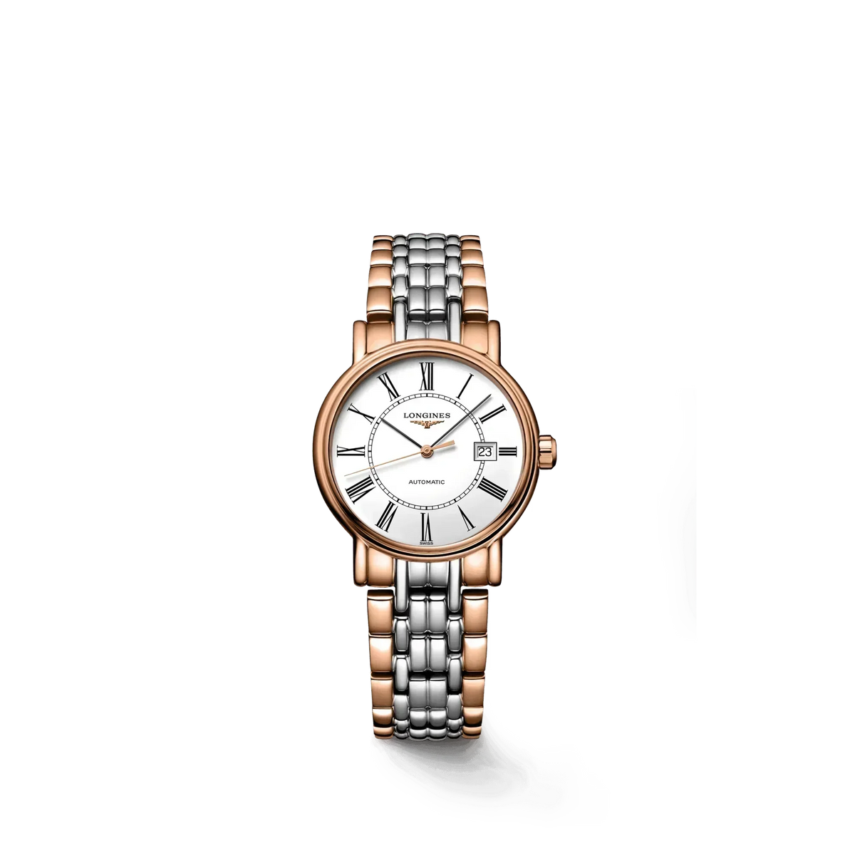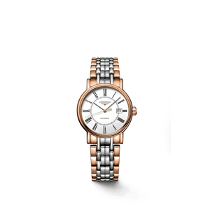 Elegance enhanced by simplicity. The Présence collection remains true to the classic, timeless elegance that characterises the Swiss watch brand Longines. Its structured case with understated lines, will delight both men and women alike. Adorned with Roman numerals, its dial pairs elegance with legibility. All of these characteristics come together to make this line an essential part of the Longines collection. Stainless steel and red PVD coating with white matt dial. Round case shape. Scratch-resistant sapphire crystal. Stainless steel and red PVD coating with triple safety folding clasp and push-piece opening mechanism. Automatic self-winding mechanical movement beating at 28'800 vibrations per hour, with a power reserve of approximately 44 hours. Functions: Hours, minutes, seconds and date. Water resistance up to 30 meters.