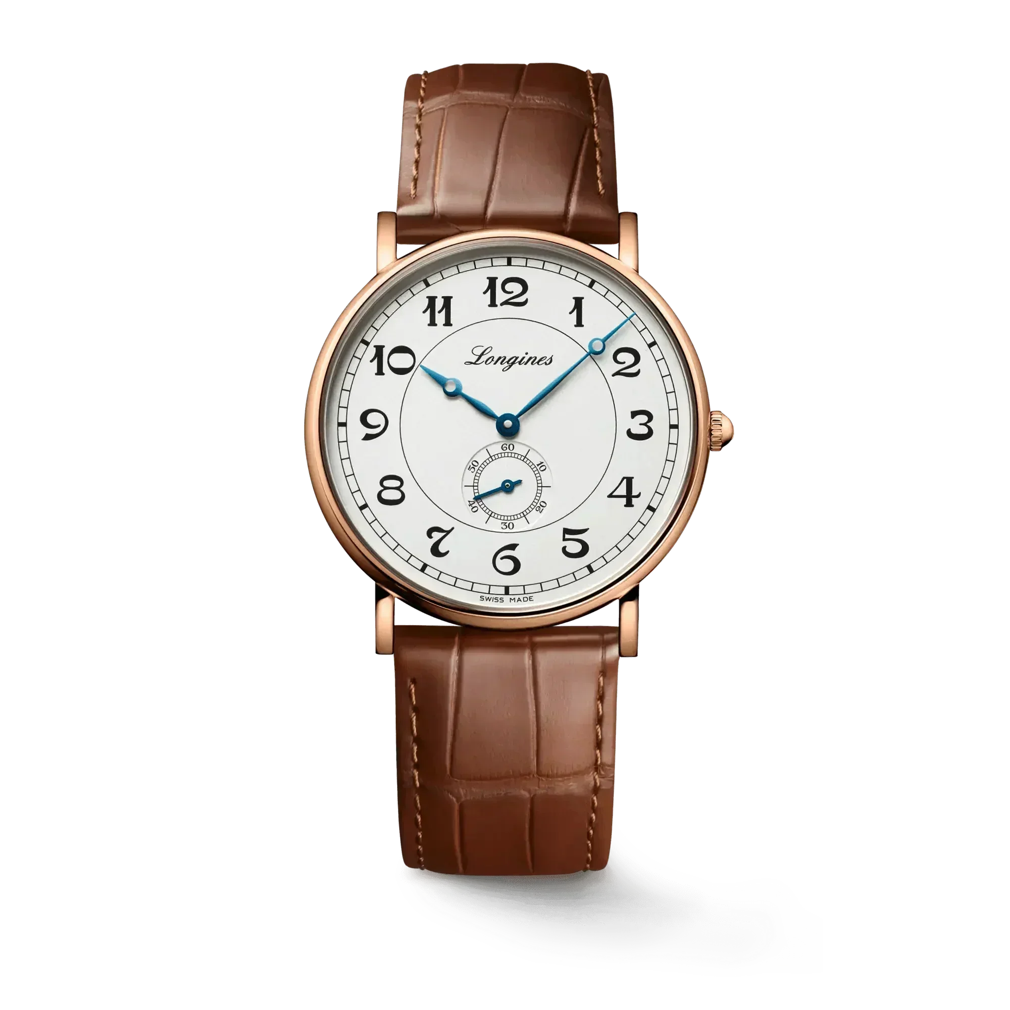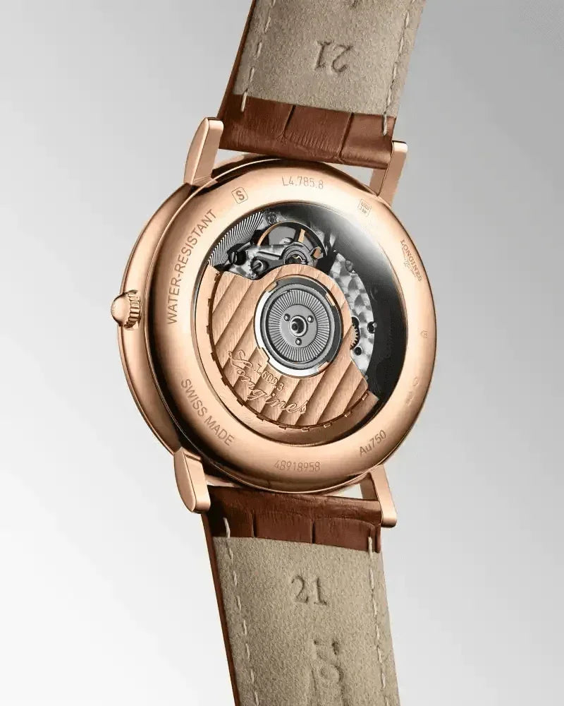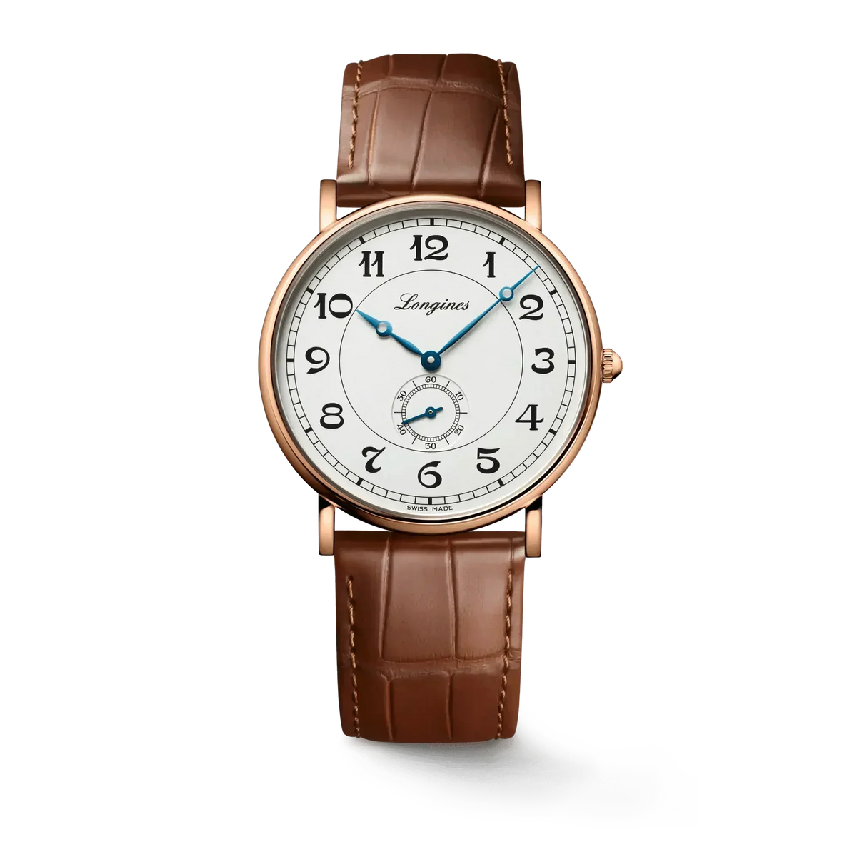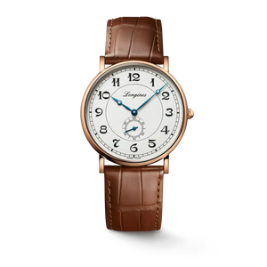 Longines combines the original aesthetics of its most remarkable historic models with the most modern watchmaking techniques. Heritage Classic pieces are a tribute to the innovative spirit that has driven Longines’ watchmakers from the outset. Longines timepieces draw from this expertise and illustrate the durability that is the brand’s signature, as well a consistent desire to honor history. 18 karat pink gold with Silver dial. Round case shape. Scratch-resistant sapphire crystal. Alligator leather with buckle clasp. Automatic self-winding mechanical movement beating at 25'200 vibrations per hour, with a power reserve of approximately 72 hours. Functions: Hours, minutes, small seconds at 6 o'clock. Water resistance up to 30 meters.