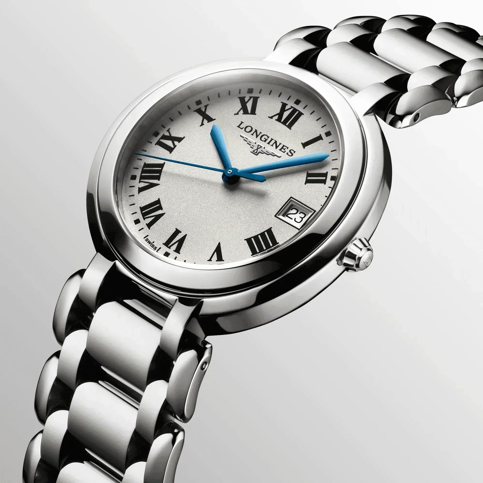A star in the Longines galaxy. A silvery moon on a spring night; a star that glistens reaches its peak and then disappears. A symbol of passing time, living time and the moon that entrances us with its rounded, delicate lines the Longines PrimaLuna is a tribute to this silvery star. Its soft silhouette is enhanced by the exquisite purity of the dial and the whole is illuminated by a play of sparkling diamonds. Graceful, magical, this is a model that will seduce women who appreciate contemporary, sophisticated elegance. Stainless steel with silver dial. Round case shape. Scratch-resistant sapphire crystal, with several layers of anti-reflective coating on both sides. Stainless steel with triple safety folding clasp and push-piece opening mechanism. Quartz movement.Hours, minutes, seconds and date. Functions: Hours, minutes, seconds and date. Water resistance up to 30 meters.