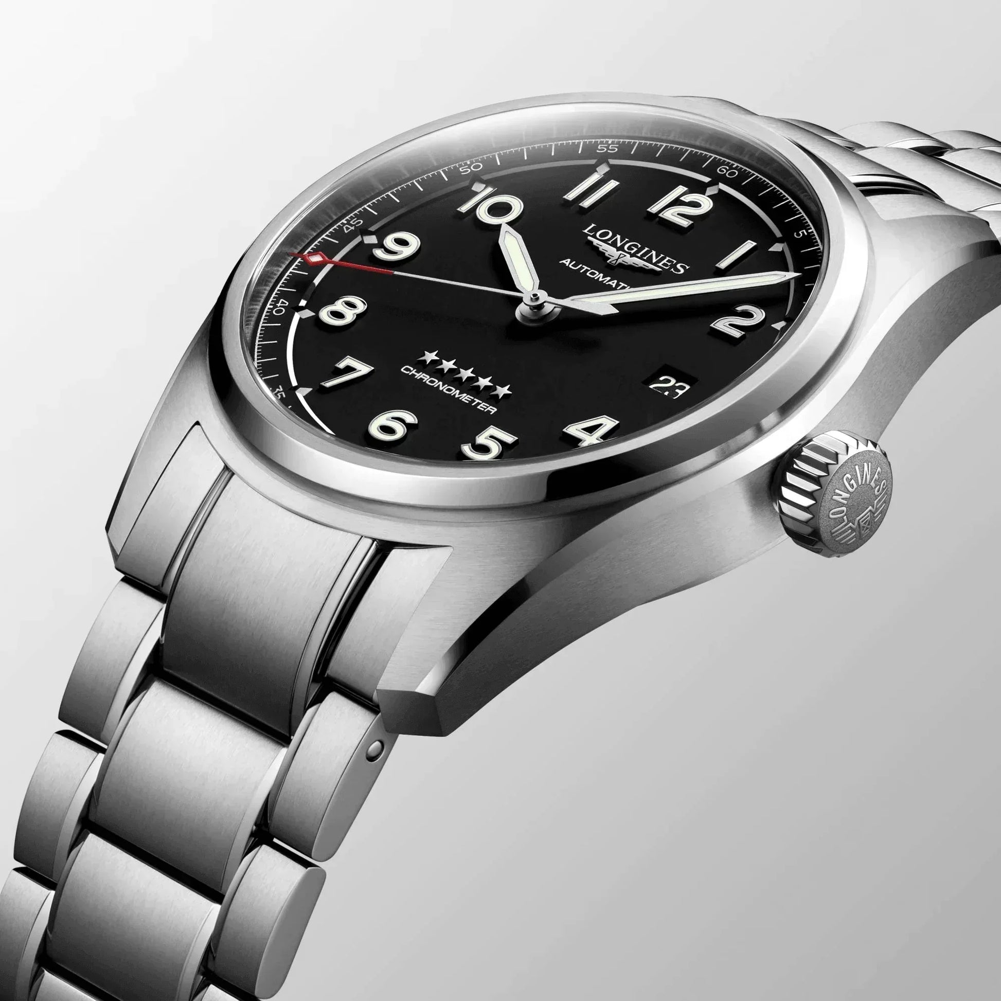 The Pioneer Spirit Lives On. Historically, Longines has accompanied legendary pioneers as they conquer air, land and sea. Today, the winged hourglass brand has drawn inspiration from this heritage to create Longines Spirit, a collection with an impeccable pedigree. This collection links history with innovation by combining references to the glory days of aviation with present-day aesthetic and technical requirements. These resolutely contemporary timepieces are a testimony to the pioneering spirit that has inspired the brand since its earliest days. A glowing tribute to these exceptional men and women who, by a record, an exploit or a display of courage, have left their mark on history - pushing new generations to surpass themselves. Stainless steel Black matt dial. Round case shape. CASE SPECIFICITIES: Screw-in crown. Scratch-resistant sapphire crystal, with several layers of anti-reflective coating on both sides. Stainless steel with triple safety folding clasp and push-piece opening mechanism. Automatic Self-winding mechanical movement beating at 25'200 vibrations per hour, with a monocrystalline silicon balance-spring power reserve of approximately 72 hours. Functions: Hours, minutes, seconds and date. Water resistance up to 100 meters.