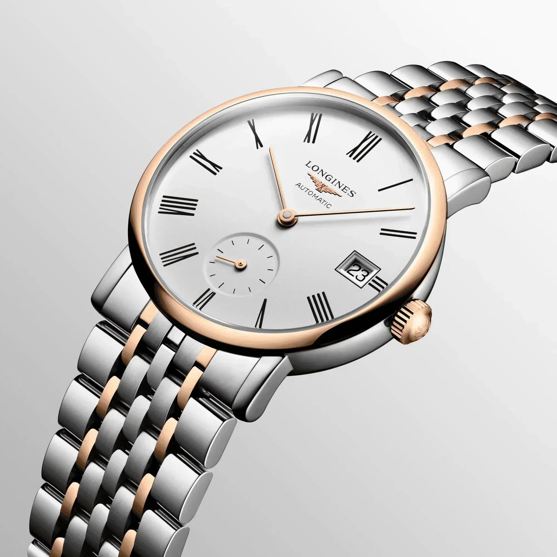 A definition of elegance. Since its earliest days, Longines has always focused on elegance. This quality can be found not only in its products but also in its communication, with the now famous slogan "Elegance is an attitude". So it comes as no surprise that the brand is now launching the Longines Elegant Collection, which comprises models that are the perfect embodiment of the classical design and sleek lines typical of Longines timepieces. Available in three sizes and fitted with self-winding, mechanical movements, these watches offer a broad choice of dials, each presenting its own definition of elegance. Stainless steel and 18 karat pink gold cap 200 with White matt dial.Dial set with 13 Top Wesselton VS-SI diamonds, for a total of 0.032 carats. Round case shape. Scratch-resistant sapphire crystal, with several layers of anti-reflective coating on both sides. Stainless steel and 18 karat pink gold cap 200 with triple safety folding clasp and push-piece opening mechanism. Automatic self-winding mechanical movement beating at 25'200 vibrations per hour, with a power reserve of approximately 72 hours. Functions: Hours, minutes, small second at 6 o'clock and date. Water resistance up to 30 meters.