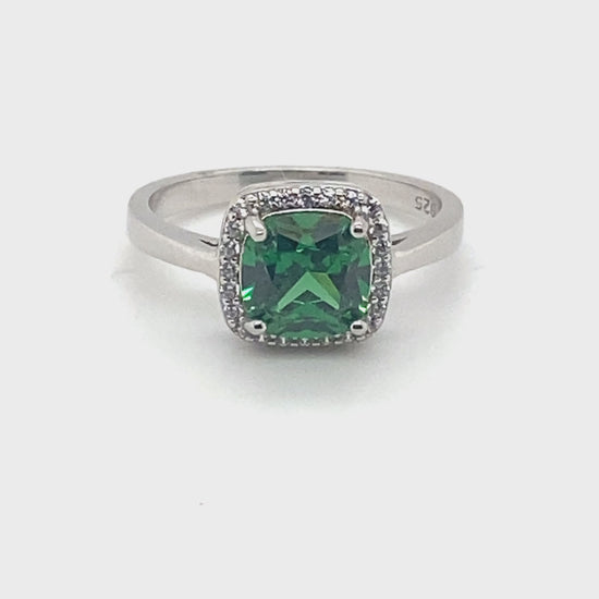 May Birthstone Emerald Color Cushion Cut CZ Ring in Sterling Silver