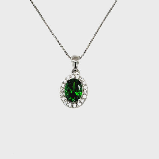 May Birthstone oval-cut Green CZ pendant set in Sterling Silver with small white cubic zirconia stones. It is a beautiful pendant designed to bring out the true colour of the centre gem. Pendant comes with an 18" Sterling Silver Chain. It is a perfect gift for yourself or for someone special to celebrate the special birthday or other memorable occasions.