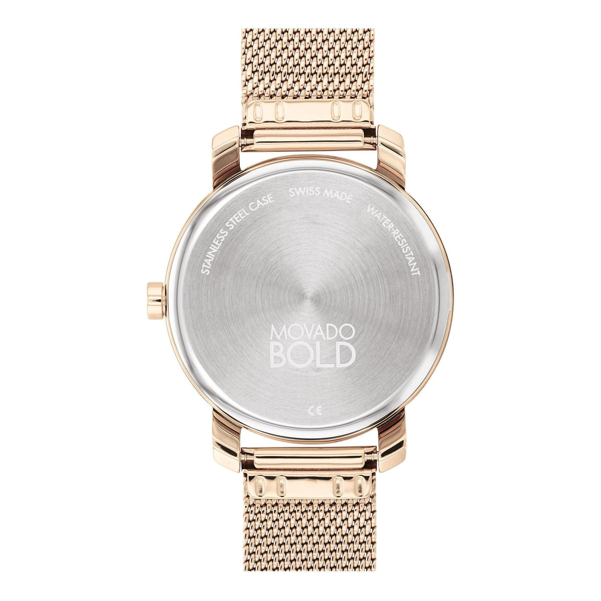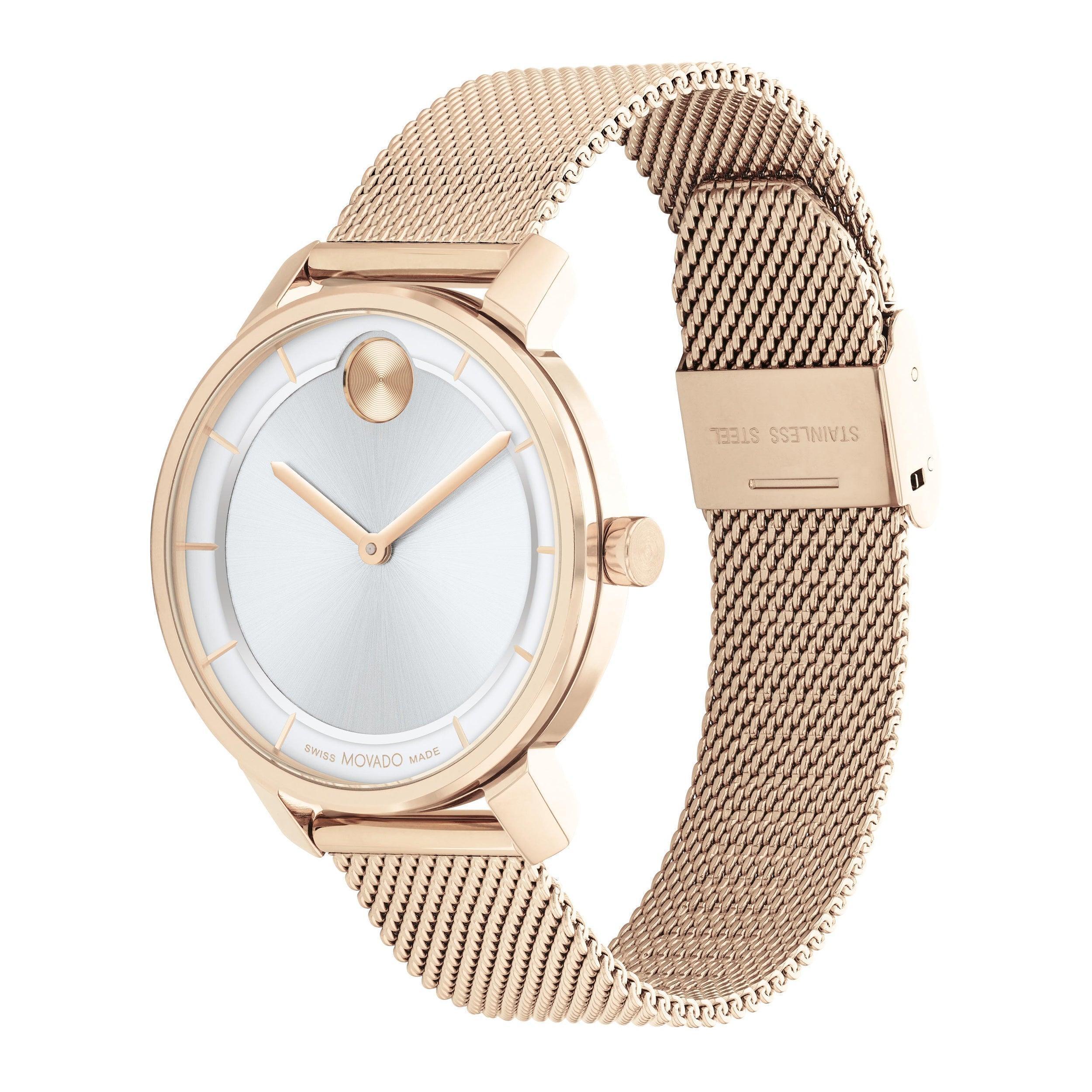 This womens bold watch from movado pairs a contemporary rose gold ion plated stainless steel mesh link bracelet with a classic 34mm flat rose gold tone ion plated stainless steel case. The silver sunray dial has a contrasting rose gold tone sunray dot and hands topped by a K1 mineral crystal. The watch features a Swiss quartz movement, and is water resistant to 30 meters. Sliding clasp. Case size 34mm.