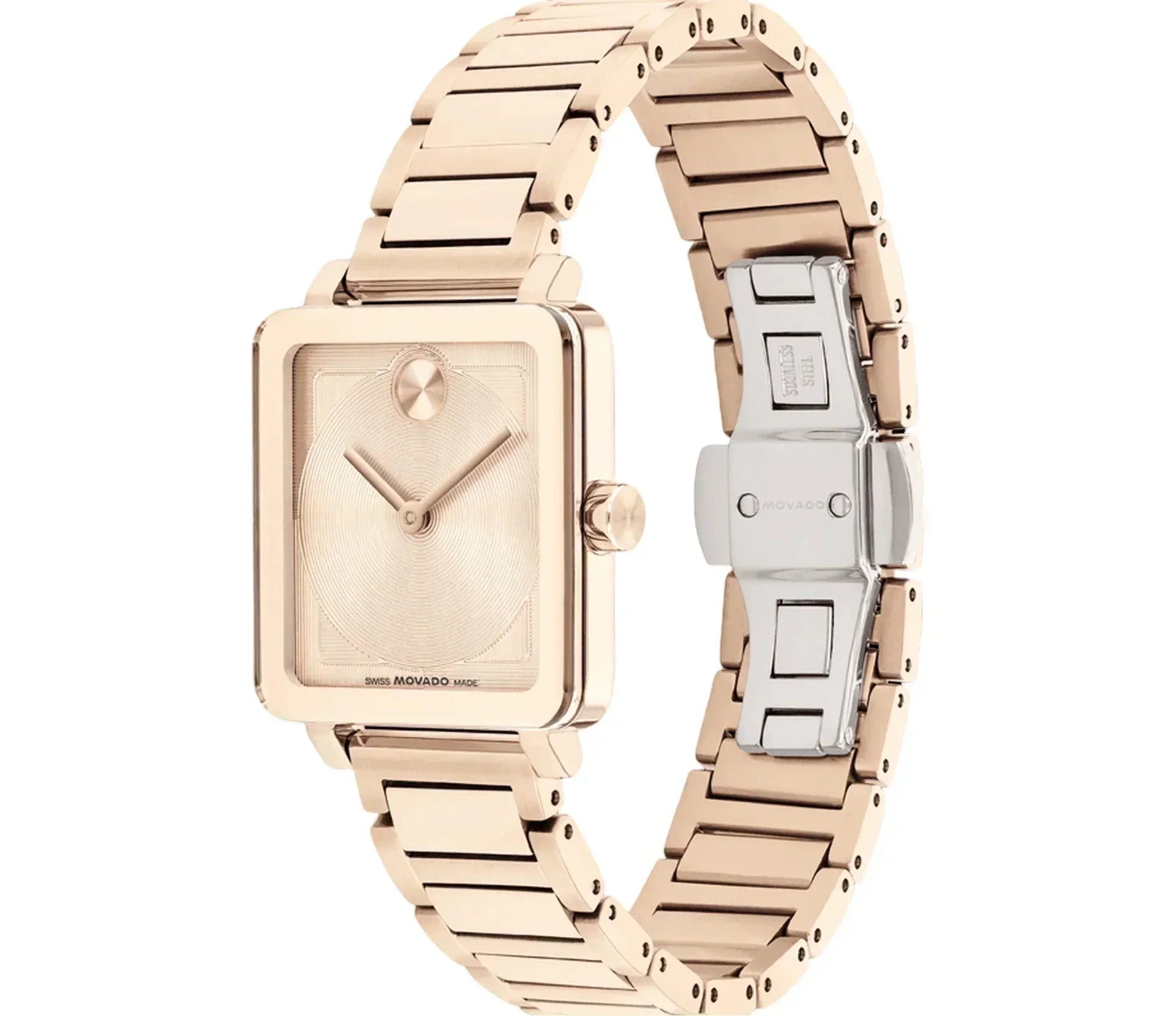The BOLD Evolution 2.0 is defined by an elevated, bold case and a dimensional micro-textured dial. This 26mm square watch features a rose gold-tone lacquer dial, slim tonal hands, and a dot at 12 o'clock. Water resistance up to 30 meters. K1 mineral crystal. Deployment clasp with push button.