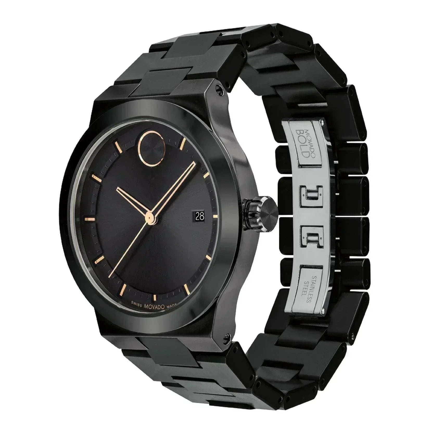 Movado bold Fusion 42mm. Black ion plated stainless steel case and bracelet with a black ceramic bezel and black toned dial. Quartz movement. Case size 42mm. Water resistant up to 50 meters. K1 mineral crystal. Deployment clasp.