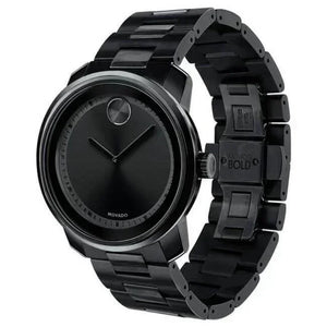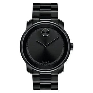 Movado Trend watch, 43mm Black ion-plated stainless steel case, K1 crystal with a ring of reflective Black metallization, Black sunray dial with matching sunray dot, hands and stamped hour/minute index, Black ion-plated stainless steel link bracelet with push-button deployment clasp. Water resistance upto 30 meters.