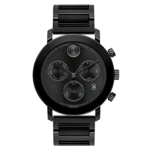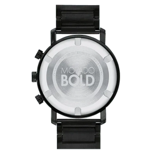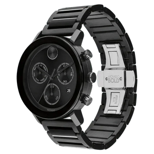 Black ion-plated stainless steel case and bracelet. Fixed black ion-plated bezel. Black dial with black hands and index hour markers. Movado dot appears at the 12 o'clock position. Dial Type: Analog. Date display at the 4 o'clock position. Chronograph - two sub-dials displaying: 60 second and 30 minute. Day of the week sub-dial. Quartz movement. Scratch resistant K1 crystal. Pull / push crown. Solid case back. Round case shape, case size: 42 mm. Band width: 22 mm. Fold over clasp with a push button release. Water resistant at 30 meters / 100 feet. Functions: chronograph, date, hour, minute, second. Bold Evolution Series. Casual watch style. Watch label: Swiss Made. Movado BOLD Evolution Chronograph Quartz Black Dial Men's Watch 3600684.
