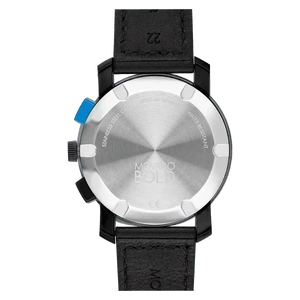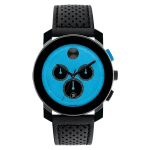 Movado BOLD TR90 Chronograph, 43.5mm Black TR90 composite material and stainless steel case, bright blue dial with black sunray dot and hands on a black perforated leather strap. Scratch Resistant K1 Mineral. Case size 43.5 mm. Water resistance upto 30 meters.