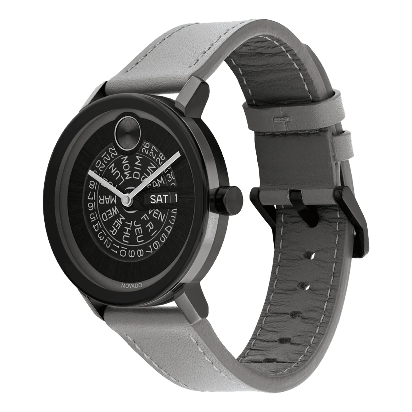 Movado BOLD Evolution, 40mm black & gunmetal ion-plated stainless steel case with a black dial and tinted grey transparent day and date centerzone on a grey leather strap. Scratch resistant K1 mineral, buckle clasp. Swiss quartz chronograph movement. Case size 40 mm. Water resistance upto 30 meters.