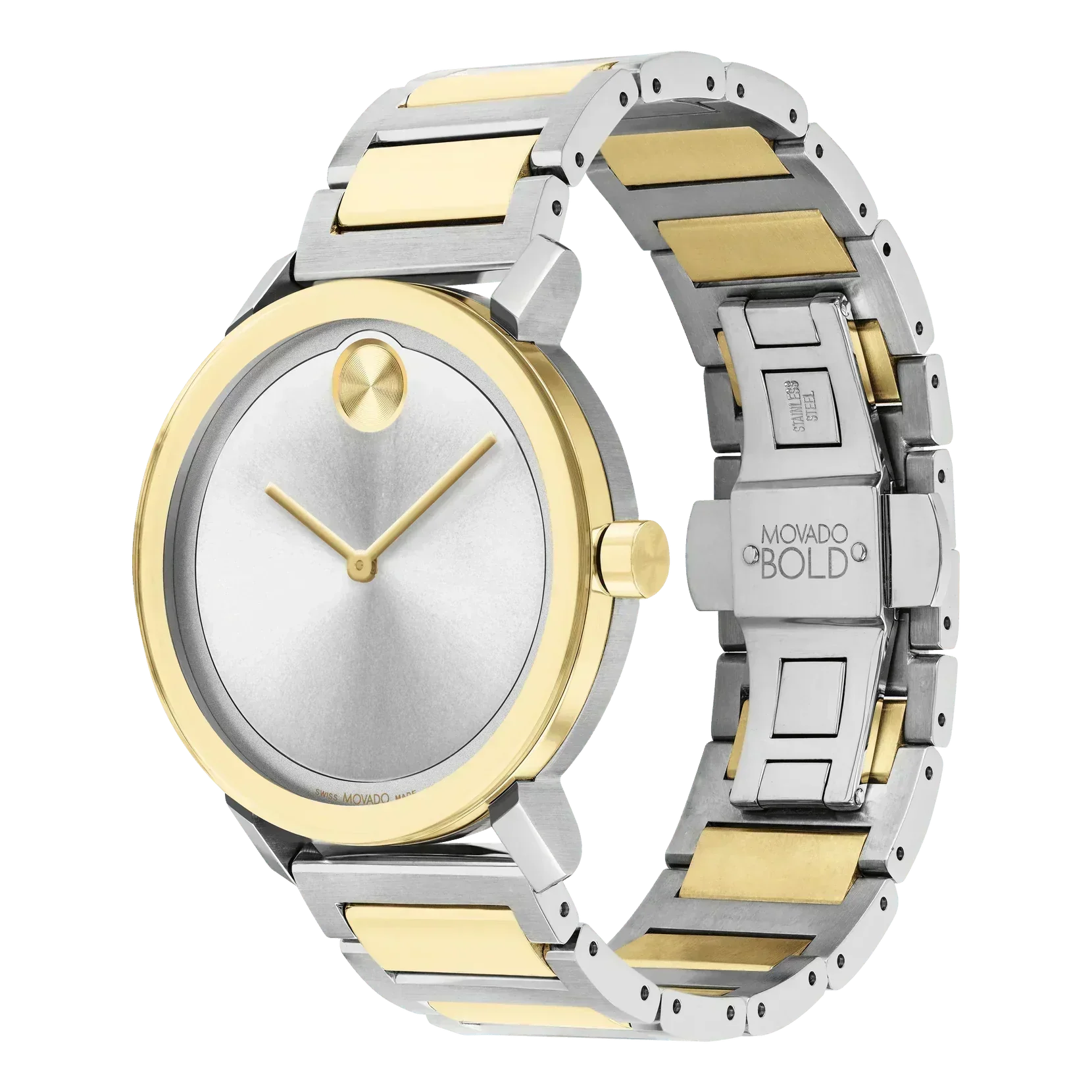 Ultra-modern minimalist design with a timeless twist in sleek stainless steel and gleaming yellow gold ion-plated accents. This on-trend mixed-metal watch features a 40mm case with a silver-toned dial, accented by a rich golden ion-plated finish at the bezel, hands and our iconic dot, paired with a two-tone bracelet.