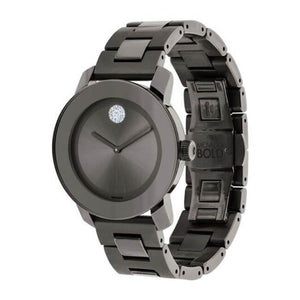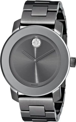Grey ion-plated stainless steel case and bracelet. Fixed mirror-finished blue ion-plated bezel. Grey metallic dial with grey hands. No markers. Clear Swarovski crystal-set Movado dot appears at the 12 o'clock position. Dial Type: Analog. Quartz movement. Scratch resistant K1 crystal. Solid case back. Case diameter: 36 mm. Case thickness: 10 mm. Round case shape. Bracelet width: 18 mm. Deployment clasp with push button release. Water resistant at 30 meters / 100 feet. Functions: hour, minute. Casual watch style. Watch label: Swiss Made. Movado Bold Grey Metallic Grey ion-Plated Stainless Steel Ladies Watch 3600103.