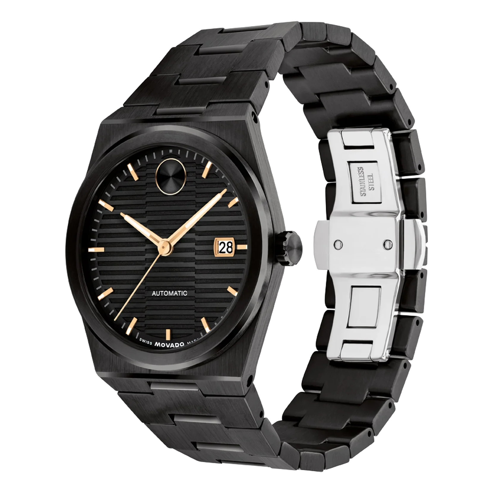 The BOLD Quest Automatic looks to the future with a shaped case and an integrated bracelet. A Swiss made self-winding movement drives this watch, powered by the motion of your wrist. This 39mm watch features a black dial, rose gold tone hands, and an exhibition case back.