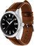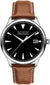 Stainless steel case with a brown leather strap. Fixed stainless steel bezel. Black dial with silver-tone hands and index hour markers. Minute markers around the outer rim. Dial Type: Analog. Luminescent hands and markers. Date display at the 3 o'clock position. Swiss quartz movement. Scratch resistant sapphire crystal. Pull / push crown. Solid case back. Case size: 40 mm. Round case shape. Tang clasp. Water resistant at 30 meters / 100 feet. Functions: date, hour, minute, second. Casual watch style. Movado Heritage Black Dial Men's Leather Watch 3650001.