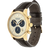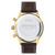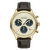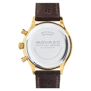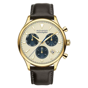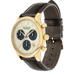 Movado Heritage Series Calendoplan chronograph mens watch, 43 mm yellow gold ion-plated stainless steel case; round parchment-colored dial with luminescent gold-toned hands and applied markers, blue subdials (day/minute counter/small seconds), printed blue minute index, date display; top-stitched brown leather strap with classic yellow gold ion-plated steel buckle. Quartz movement. Water resistance upto 30 meters.