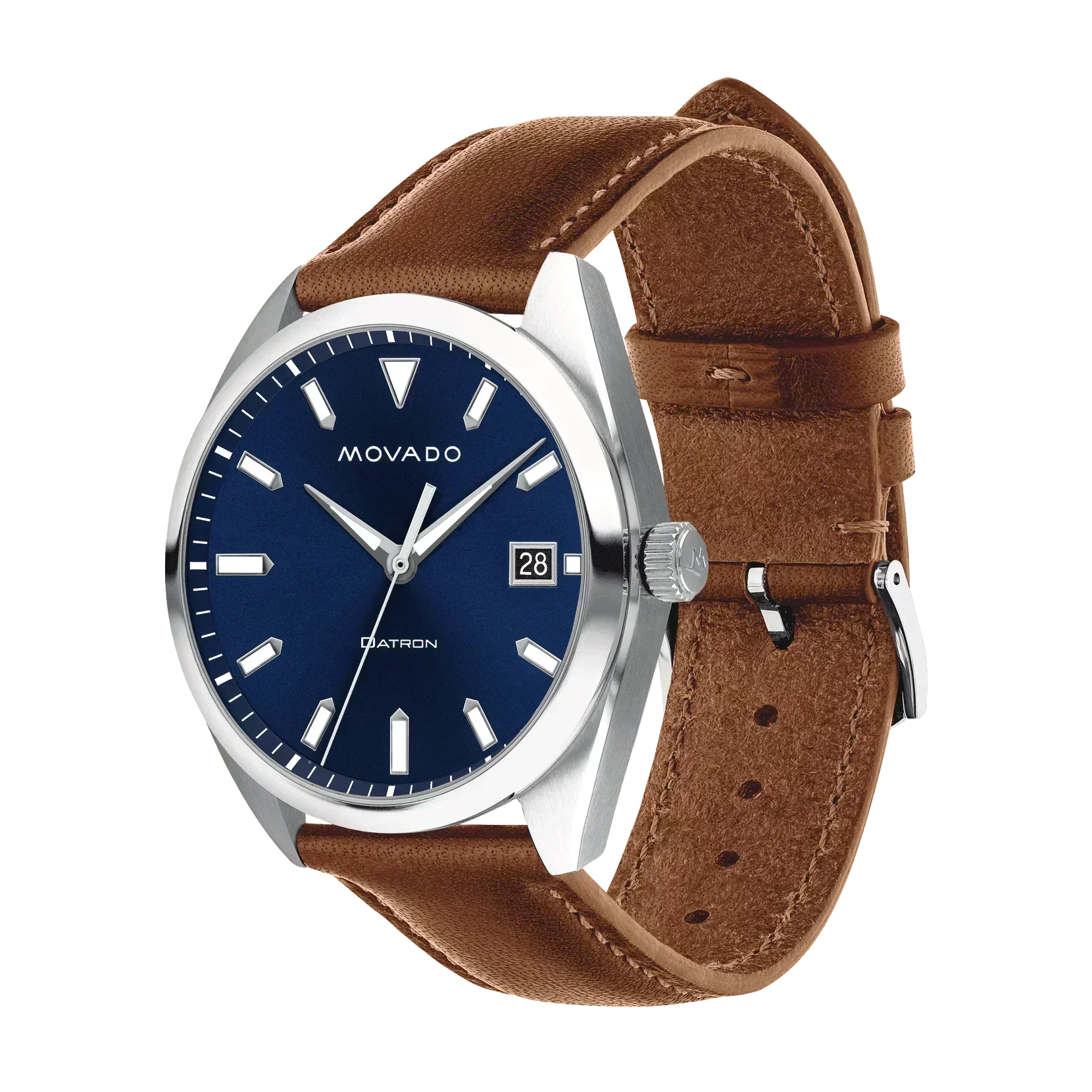 Men's Movado Heritage Series Datron watch, 39 mm stainless steel case, round navy sunray 3-hand dial with luminescent stainless steel hands and applied markers, printed white minute index, and date display, top-stitched cognac leather strap with steel buckle. Water resistance upto 30 meters.