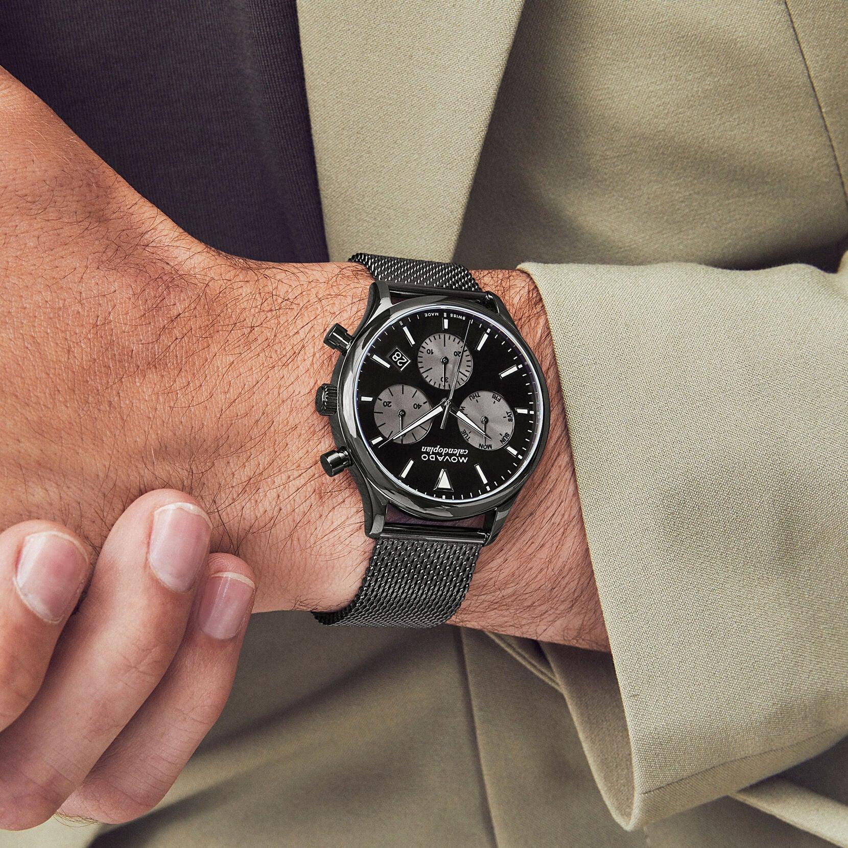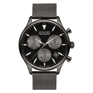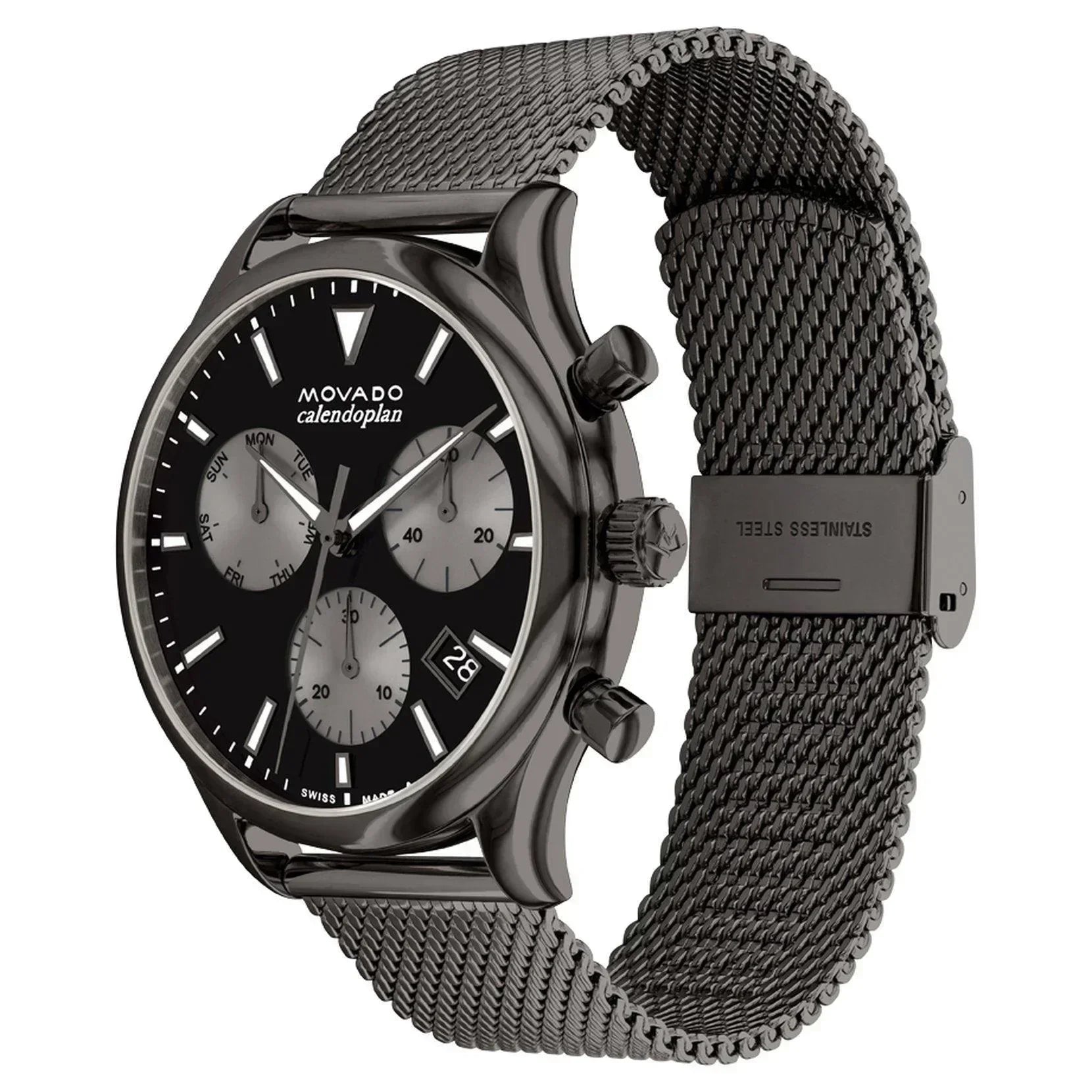 First introduced in 1950, the movado calendoplan captures the soul of mid century design with contemporary details. This timeless chronograph timepiece is inspired by our archives and features a 43mm refined gunmetal ion plated stainless steel case framing a black chronograph dial outfitted with three grey subdials, swiss super luminova accents and a date window. The design is completed with a sleek mesh bracelet in matching gunmetal ion plated stainless steel. Quartz movement. Wayer resistance up to 50 meters. Sapphire crystal. Sliding clasp.