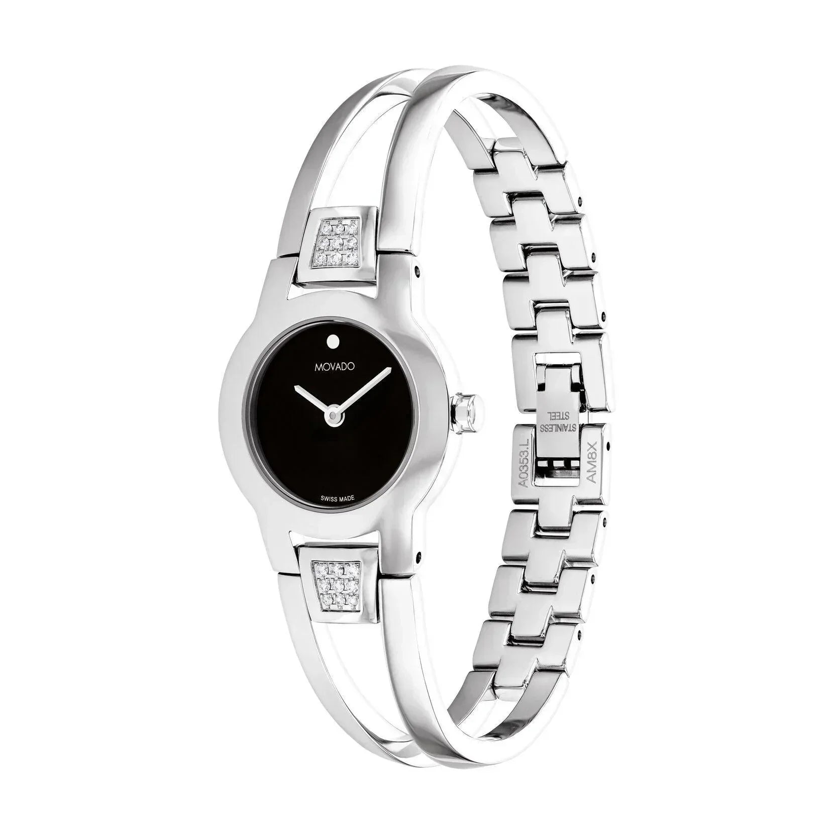 Elegant, sculpted modern design. Women's movado Impresa watch, 24 mm stainless steel case, black Museum dial with silver toned dot and hands, stainless steel diamond set double bar bangle bracelet with back sizing links and jewelry clasp, sapphire crystal, Swiss quartz movement.