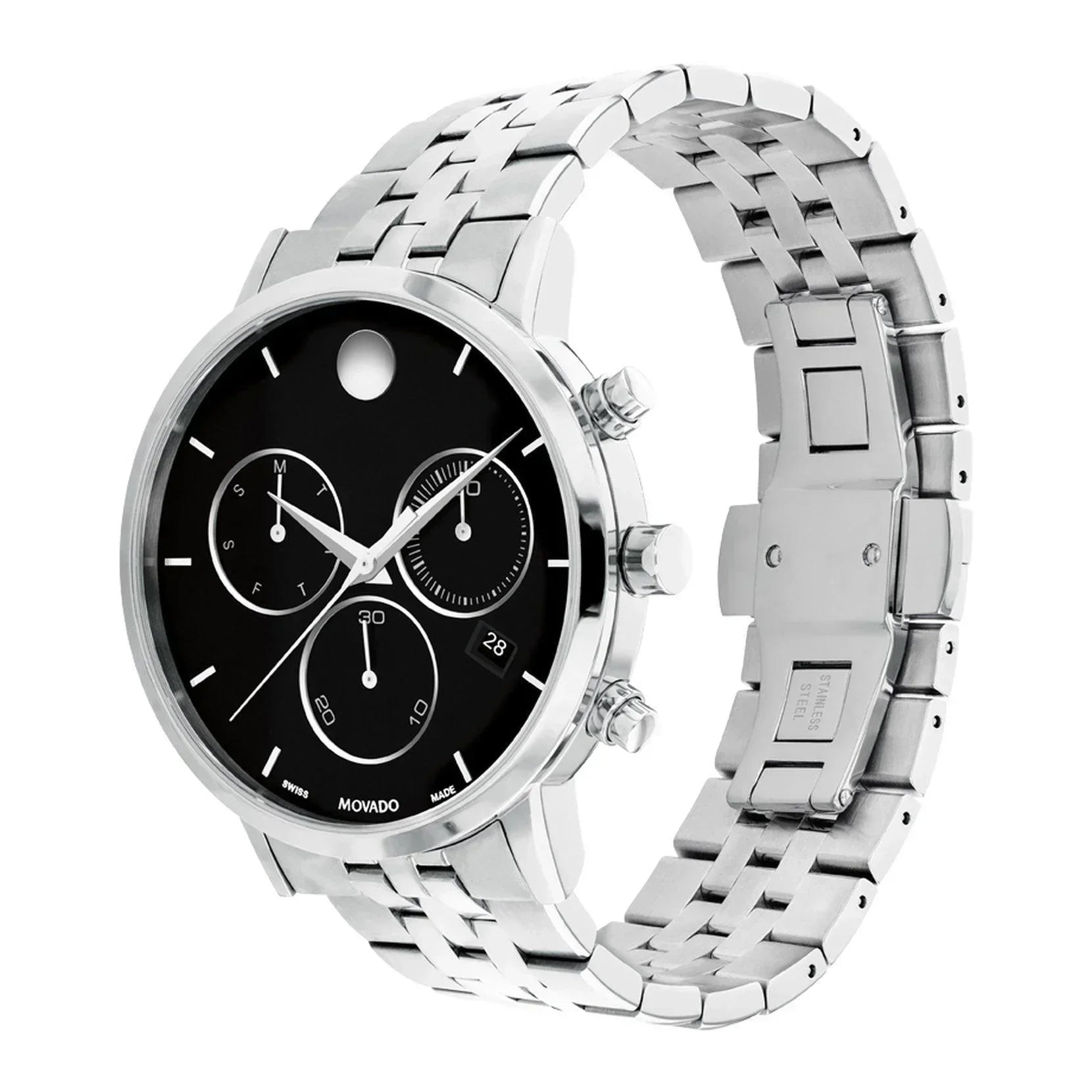 It’s time you owned a masterpiece. The Movado Museum Classic is an icon of modern design, featured in museums worldwide and renown for the elegant simplicity of the dial defined by a single dot at 12 o’clock, a design element that symbolizes the sun at high noon. In this style, we’ve paired a 42mm case in stainless steel with a black chronograph dial—outfitted with three subdials, our signature dot and slender hands—and a timeless stainless steel bracelet. Quartz movement. Water resistance up to 30 meters. Sapphire crystal. Deployment clasp with Push button.