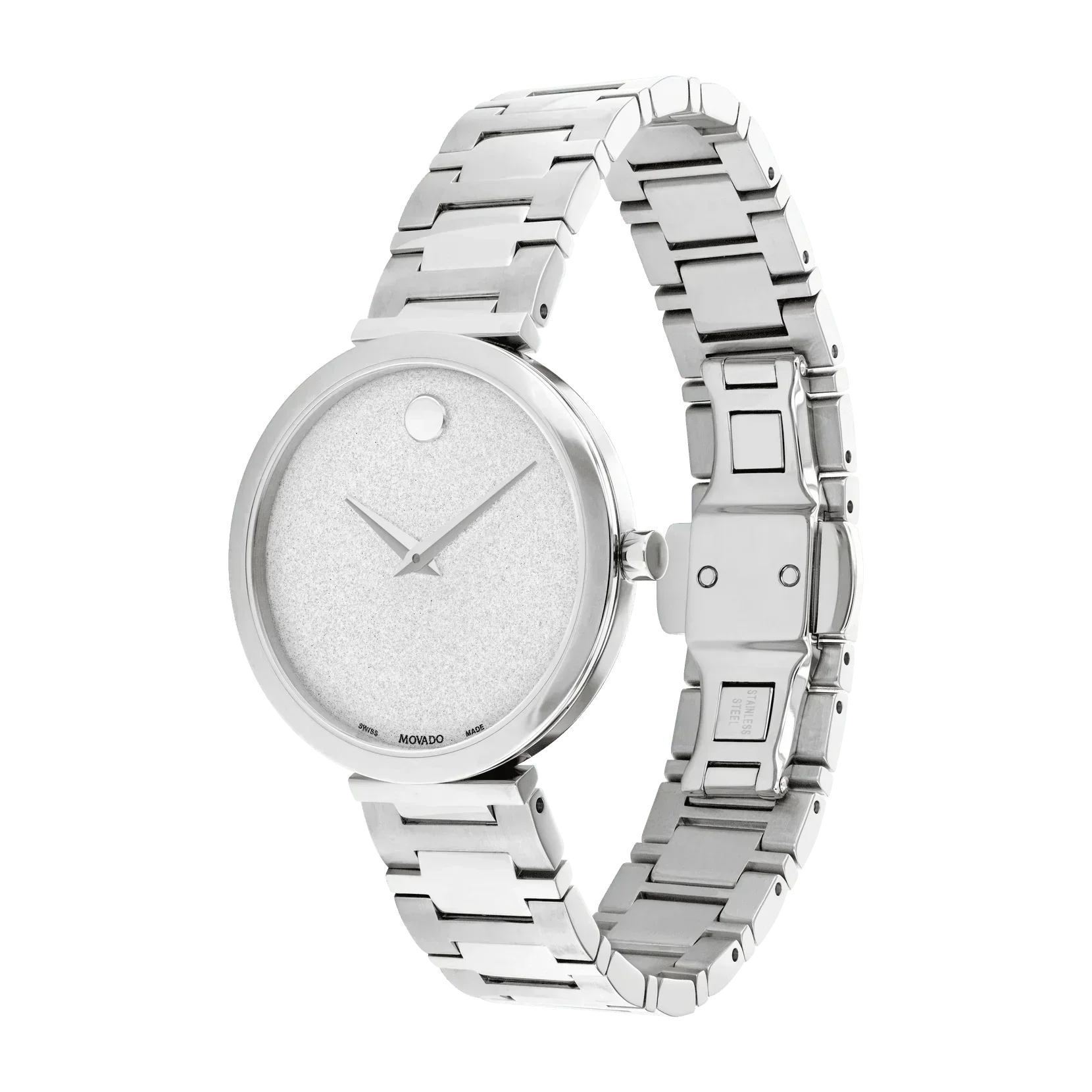 Stainless steel case with a stainless steel bracelet. Fixed stainless steel bezel. White dial with silver-tone hands. No markers. The Movado dot appears at the 12 o'clock positions. Dial Type: Analog. Quartz movement. Scratch resistant sapphire crystal. Pull / push crown. Solid case back. Round case shape. Case size: 32 mm. Band width: 13 mm. Deployment clasp. Water resistant at 30 meters / 100 feet. Functions: hour, minute. Museum Classic Series. Dress watch style. Watch label: Swiss Made. Movado Museum Classic Quartz White Dial Ladies Watch 0607518.