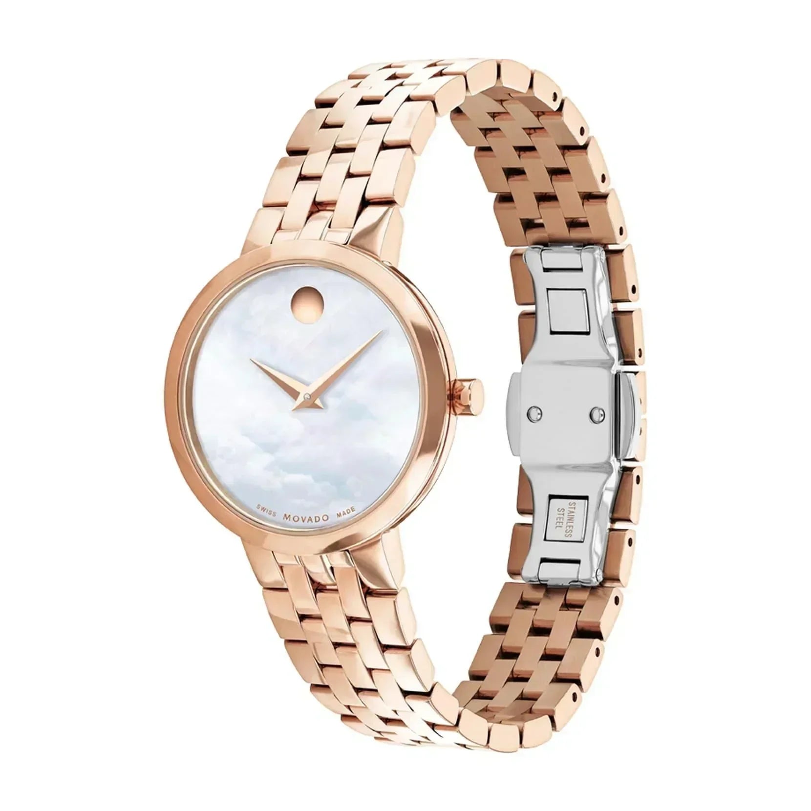 It’s time you owned a masterpiece. The Movado Museum Classic is an icon of modern design, featured in museums worldwide and renown for the elegant simplicity of the dial defined by a single dot at 12 o’clock, a design element that symbolizes the sun at high noon. In this style, we’ve paired a warm rose gold PVD 30mm case with a stunning white mother-of-pearl dial and a flexible bracelet. The signature dot and slender hands are cast in matching rose goldtone PVD for a flawless finish.
