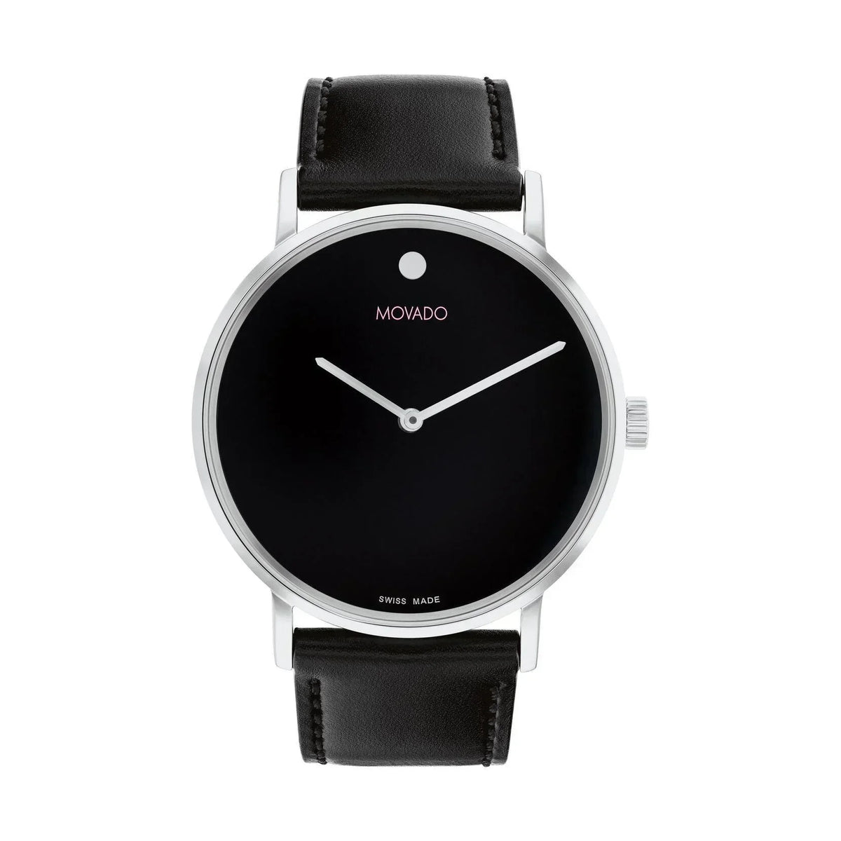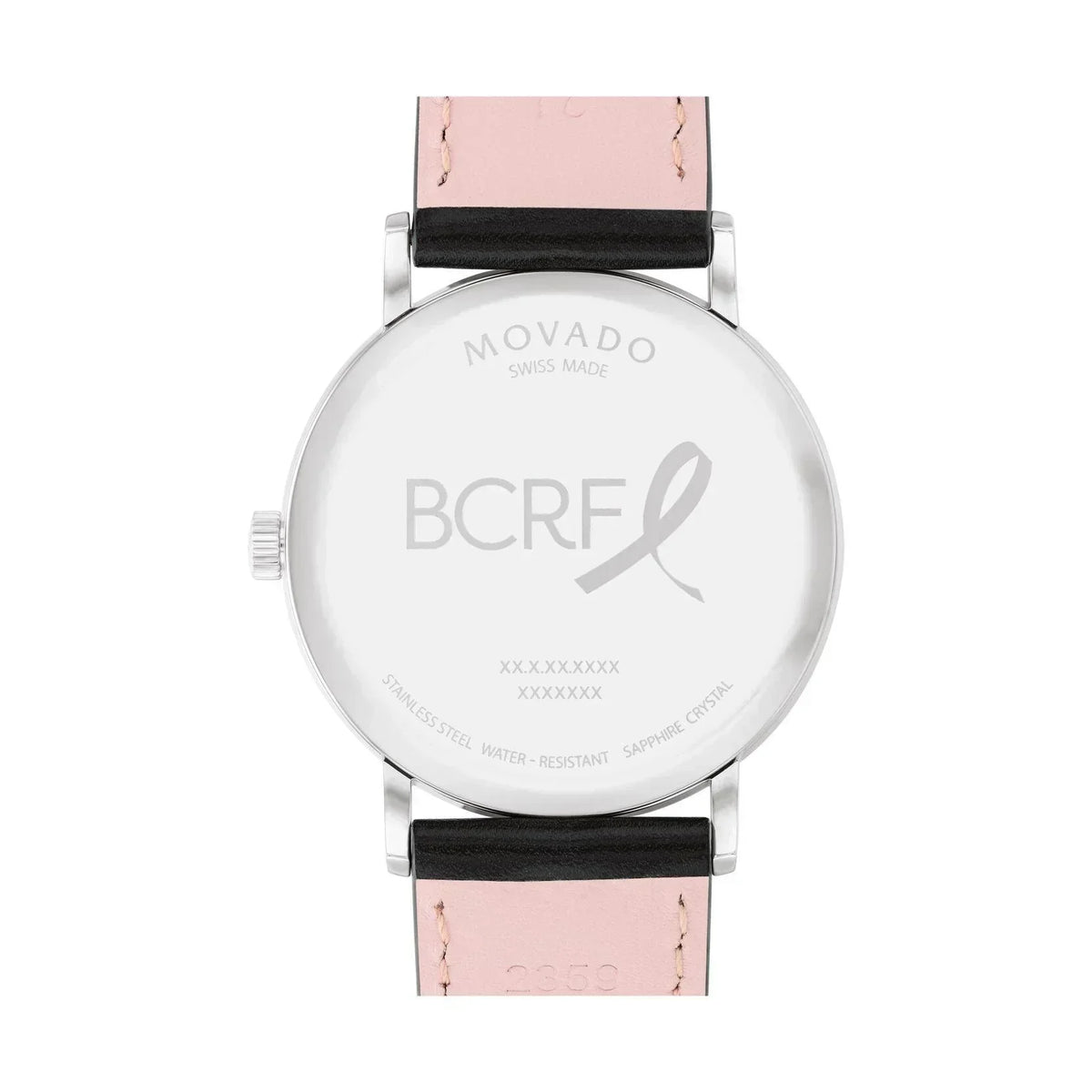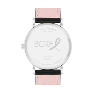 BCRF exclusive, movado signature, 40mm stainless steel case, black museum dial featuring stainless steel polished hands, black leather strap lined with pink leather, sapphire crystal, swiss quartz movement. Water resistance up to 30 meters. Pin buckle clasp.