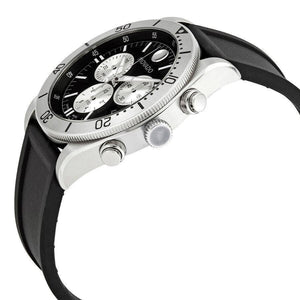 Stainless steel case with a black rubber strap. Silver dial with silver tone hands and index hour markers. Minute markers around the outer rim. Dial type analog. Date display at the 4 o'clock position. Chronograph sub dials displaying three 60 second, 30 minute and 1/10th of a second. Quartz movement. Scratch resistant sapphire crystal. Solid case back. Round case shape. case size 41 mm. Water resistant at 30 meters / 100 feet. Functions date, hour, minute, second. Watch label swiss made. Movado sport quartz silver dial watch 0607438.