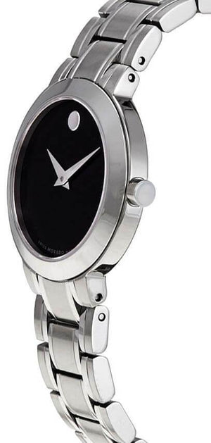 Stainless steel case with a stainless steel bracelet. Fixed stainless steel bezel. Black dial with silver-tone dauphine-style hands. No markers. The Movado dot appears at the 12 o'clock position. Dial Type: Analog. Quartz movement. Scratch resistant sapphire crystal. Pull / push crown. Solid case back. Round case shape. Case size: 32 mm. Case thickness: 7 mm. Band width: 14 mm. Deployment clasp. Water resistant at 30 meters / 100 feet. Functions: hour, minute. Casual watch style. Watch label: Swiss Made. Movado Stiri Quartz Black Dial Ladies Watch 0607280.