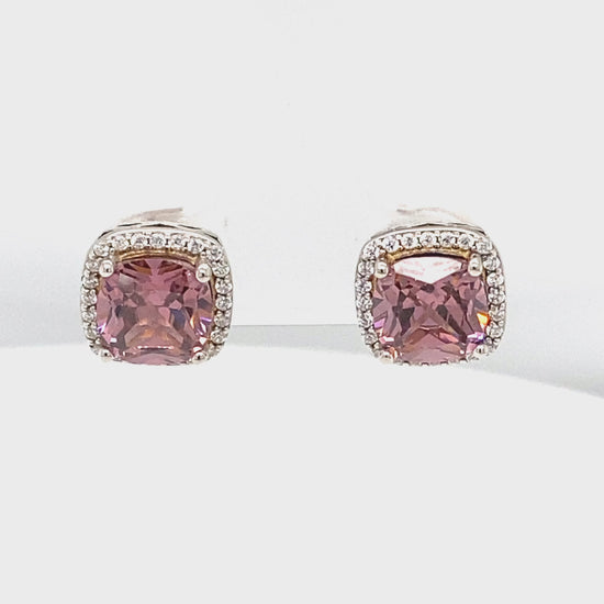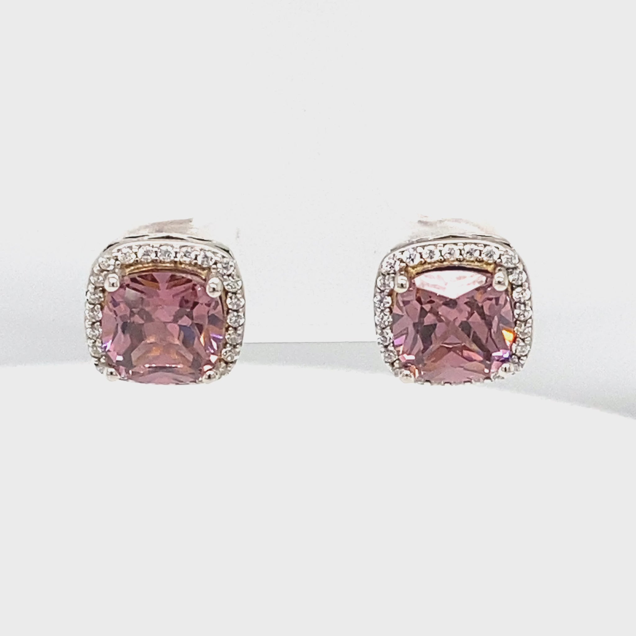 October Birthstone Sterling Silver Cushion Pink Tourmaline Color CZ Earrings