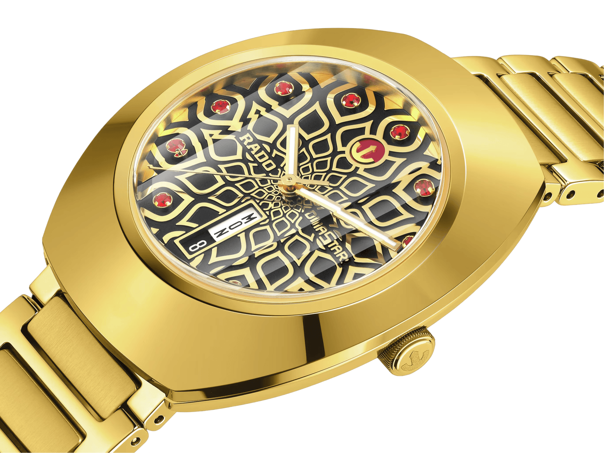 The unique DiaStar Original has a diameter of 38 mm and is water resistant down to 100 m. Framed by an ultra-shiny yellow gold couloured Ceramos™ coiffe with polished angles and detailing set over a matching, yellow gold couloured PVD coated stainless-steel case, this beautiful watch is rounded off with a vertical faceted sapphire crystal. Specifications include yellow gold coloured hands with white Super-LumiNova®, and a white day display and a black date display. The dial features eleven red cubic zirconia, on a yellow coloured harmonic pattern on a black coloured background. The Rado R764 automatic movement offers 80 hours of power reserve, with an antimagnetic Nivachron™ balance spring. The bracelet is made of yellow gold PVD coated polished and brushed stainless steel.