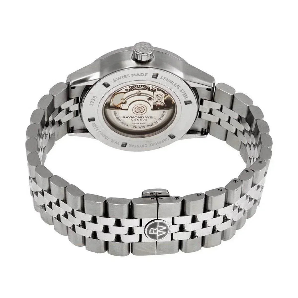 Raymond Weil Freelancer stainless steel case with a stainless steel bracelet. Fixed stainless steel bezel. Blue dial with luminous silver-tone hands and index hour markers. Minute markers around the outer rim. Dial Type: Analog. Luminescent hands and markers. Halfmoon date display. Small seconds sub-dial. Raymond Weil calibre RW 4250 automatic movement with a 38-hour power reserve. Scratch resistant sapphire crystal. Screw down crown. Solid case back. Round case shape. Case size: 42.5 mm. Case thickness: 10.7 mm. Band width: 22 mm. Fold over clasp with a double push security sytem. Water resistant at 100 meters.