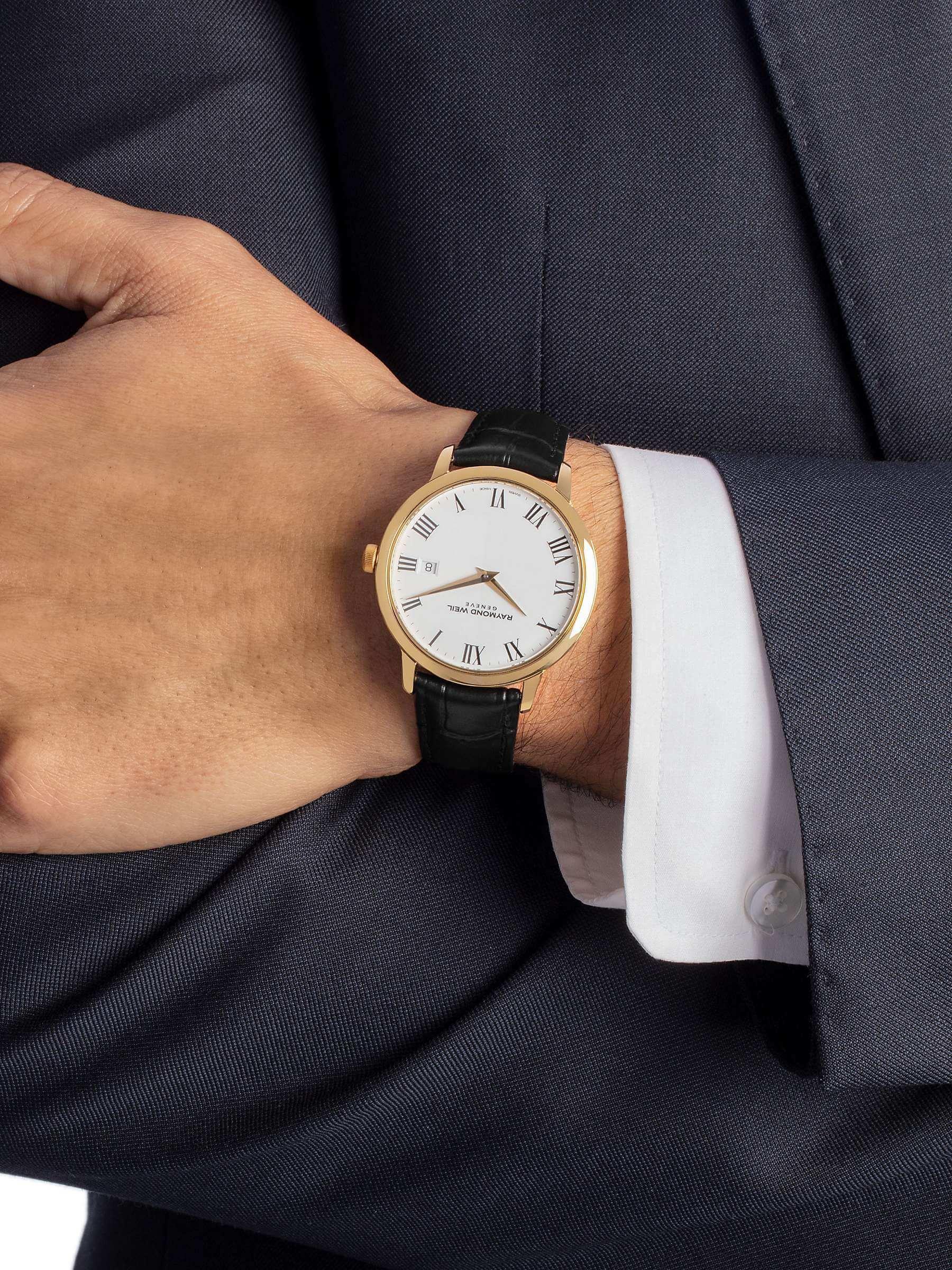Raymond Weil Yellow gold-plated stainless steel case with a black leather strap. White dial with yellow gold-tone hands and Roman numeral hour markers. Minute markers around the outer rim. Date display at the 3 o'clock position. Quartz movement. Scratch resistant sapphire crystal. Case size: 39 mm. Water resistant at 50 meters.