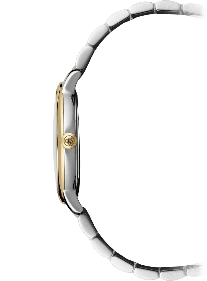 Equipped with a quartz movement and made entirely of stainless steel, this toccata men’s two-tone watch features a 39 mm stainless steel case with yellow gold PVD plating and a date window at 3 o’clock. The white lacquered dial is set with applied Roman numeral indexes and has a railway-track chapter ring that aids readability. To complement this modern classic, a pair of blue hands has been added.Refined design and timeless materials: the toccata collection celebrates the artistic and musical spirit behind the Brand’s DNA. Following in the footsteps of the great composers, toccata promotes the Swiss horology of RAYMOND WEIL while respecting the tradition and heritage handed down from generation to generation within the family company.