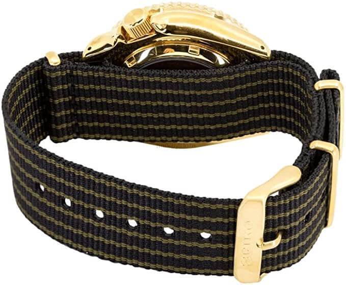 Seiko 5 sports Brian May limited edition ‘Red Special II' men's watch SRPH80K1. Gold-tone stainless steel case with a black and sand nylon strap, and red dial. Automatic movement. Case size 42.5mm. Water resistance up to 100 meters. Hardlex crystal. Buckle clasp.